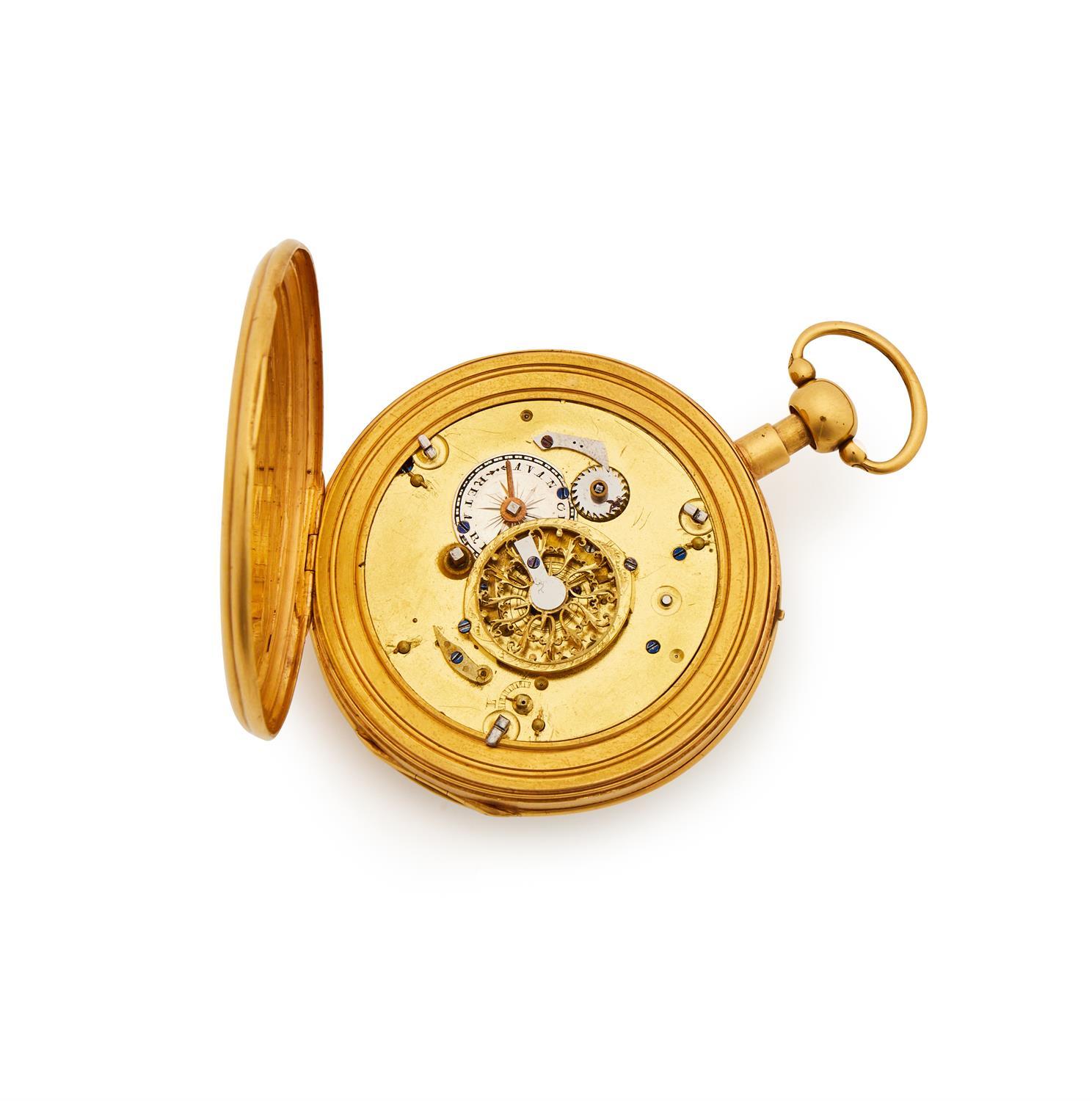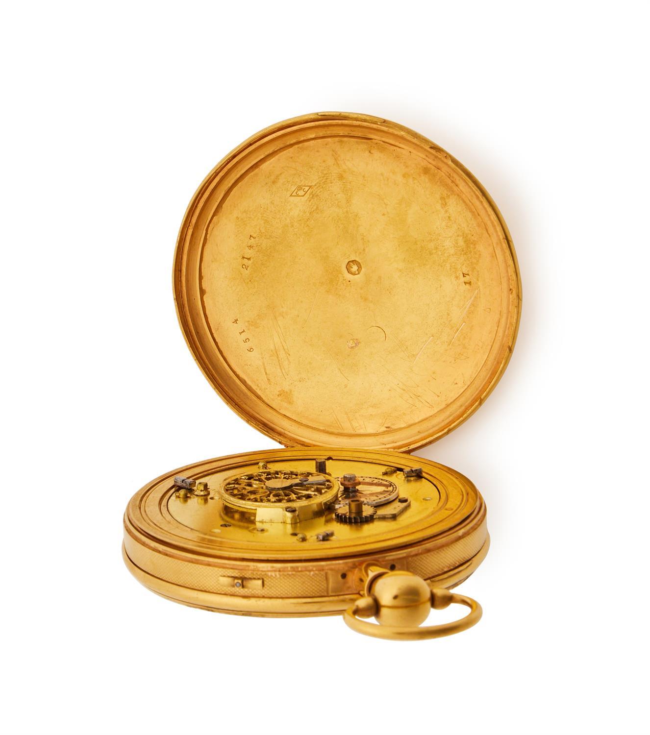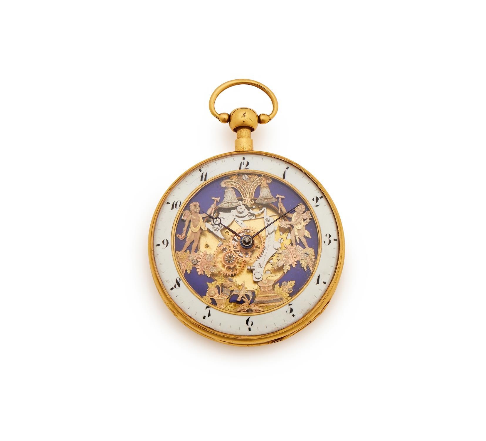 A FINE SWISS GOLD VERGE QUARTER-REPEATING ‘JACQUEMART’ AUTOMATON POCKET WATCHUNSIGNED, PROBABLY GENEVA, CIRCA 1820The frosted gilt full-plate single fusee movement with four columnar pillars pinned through the backplate and verge escapement regulated by sprung brass three-arm balance with Tompion type regulation, the repeat work ‘ting-tang’ sounding the hours and quarters on a graduated pair of gongs on depression the pendant, the backplate applied with delicate foliate scroll pierced rosette balance bridge and silver ADVANCE/RETARD regulation adjustment disc to centre, also with polished steel visible mainspring set-up ratchet and small V/L adjustment sector scale, the dial with open-centre revealing sub-dial work within a cobalt blue guilloche enamelled ring surround overlaid in tri-colour gold with a pair of opposing winged putti, each standing on a floral cornucopia and with an arm aloft holding a hammer to simulate the sounding of the hours and ting-tang quarters in time with the repeat on a pair of bell-design pendants suspended from scroll-shaped bracket, the lower margin decorated with a lovebird perched within foliage next to a neoclassical brazier. Set behind a convex glass within narrow white enamel chapter ring with vertically aligned Arabic hour numerals, with blued steel moon hands, the case with plain moulded-edge hinged rear cover, conforming convex-glazed front cover and engine-turned circumference fitted with a repeat lock slide and push-repeat pendant post incorporating hinged bow at twelve o’clock, the inside of the rear cover case with octagonal winged sphinx mark numbered 3, crowned initials C C within a diamond lozenge and various numbers 6514, 2147 and 17.