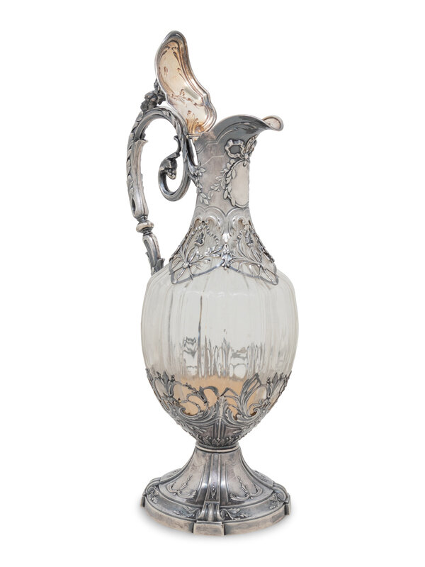 French claret jug by Auguste Guyot, early 20th century, with fluted glass body and ornate silver mounts of grapevines and scrolls.