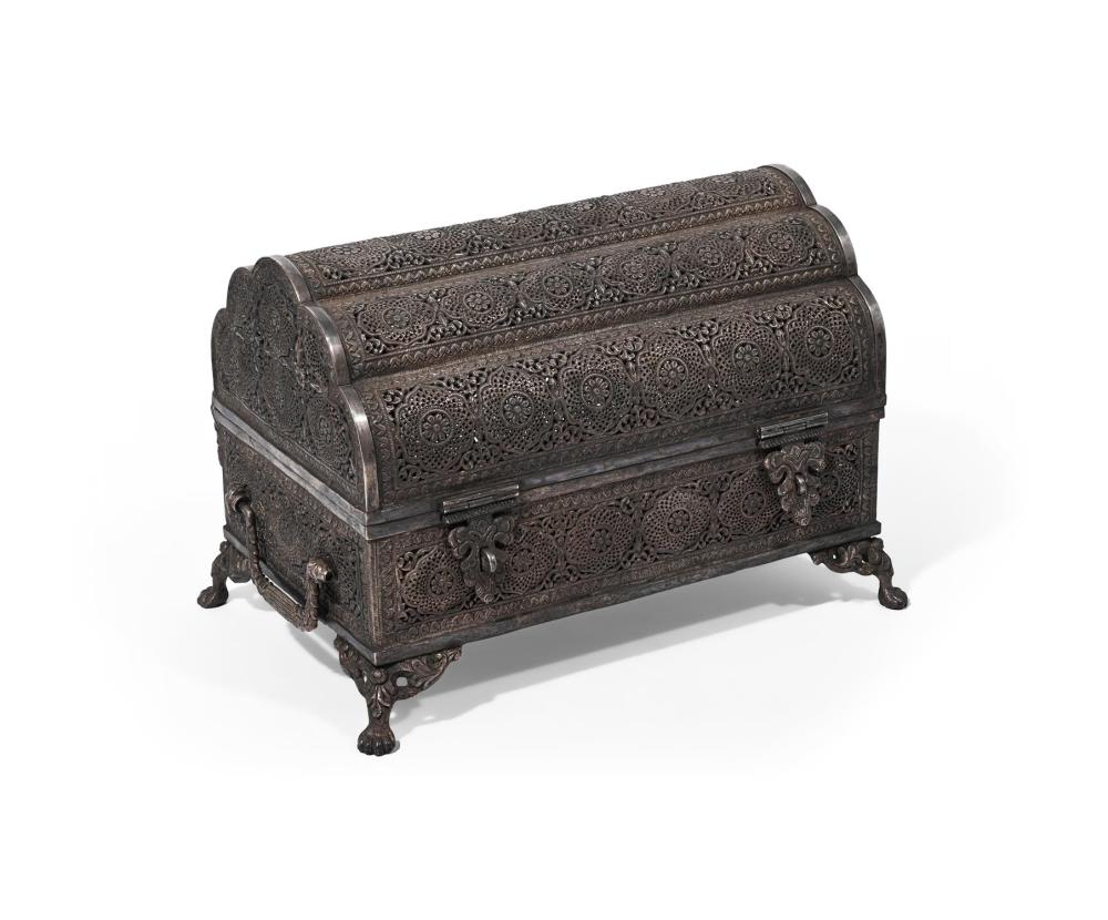An impressive 19th-century Indian silver casket featuring elaborate pierced decoration, figural handles, and lion paw feet, attributed to the Kutch region.