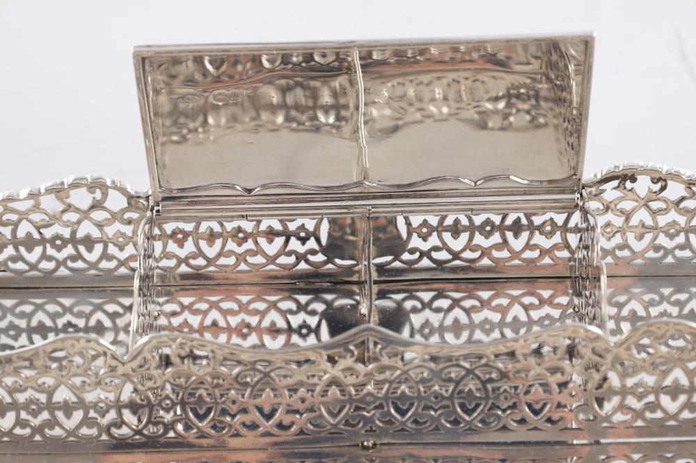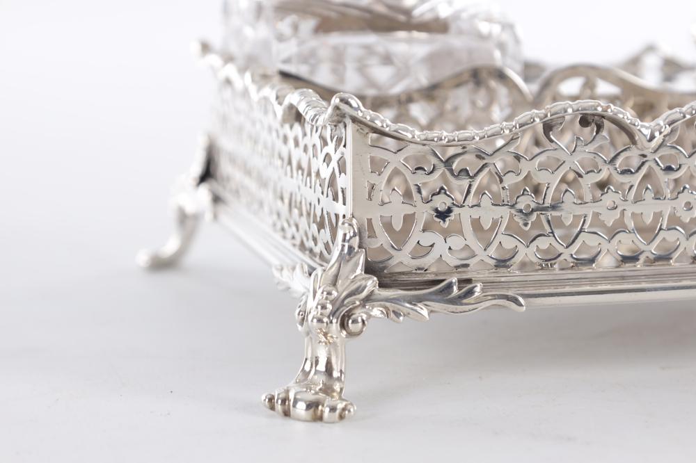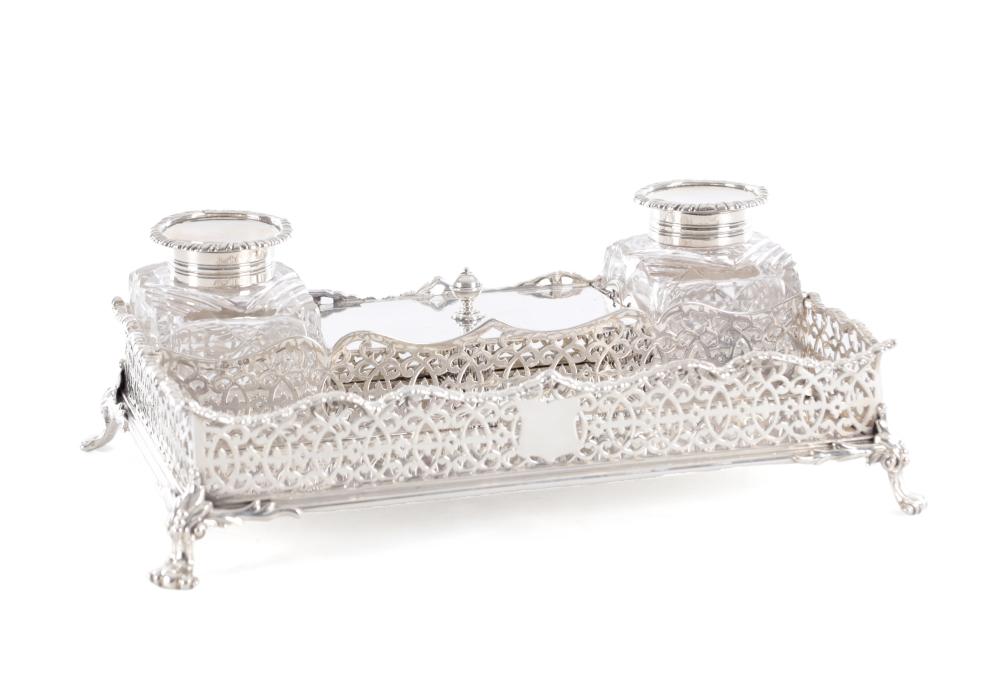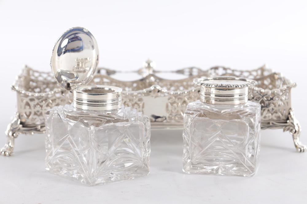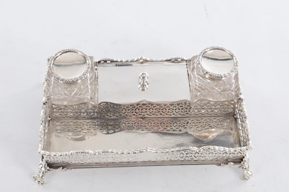 A Victorian silver ink stand of rectangular form, featuring pierced scrolling sides, two cut-glass inkwells with silver mounts, and a central lidded compartment.
