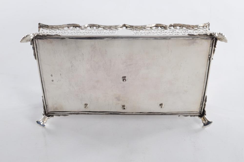 This refined Victorian silver ink stand, crafted by George Fox in London in 1866, exemplifies mid-19th-century English desk silver. The rectangular stand is beautifully decorated with pierced scrolling sides and shaped borders, displaying fine openwork craftsmanship typical of the period.