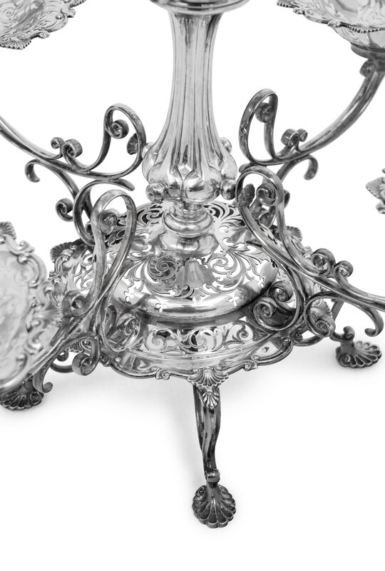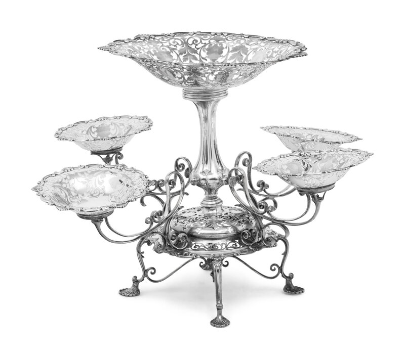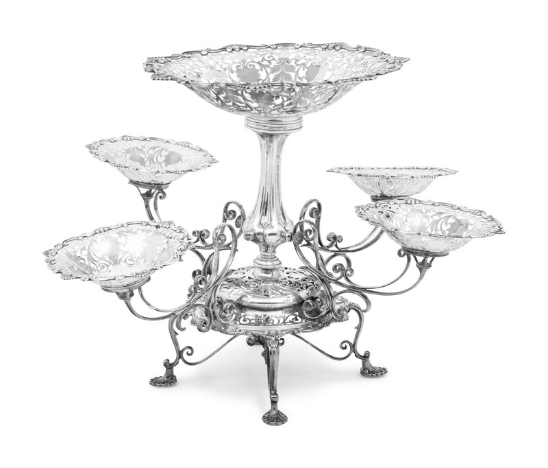 An elegant Edwardian silver epergne with central bowl and five satellite dishes, richly adorned with pierced scrollwork and floral motifs.