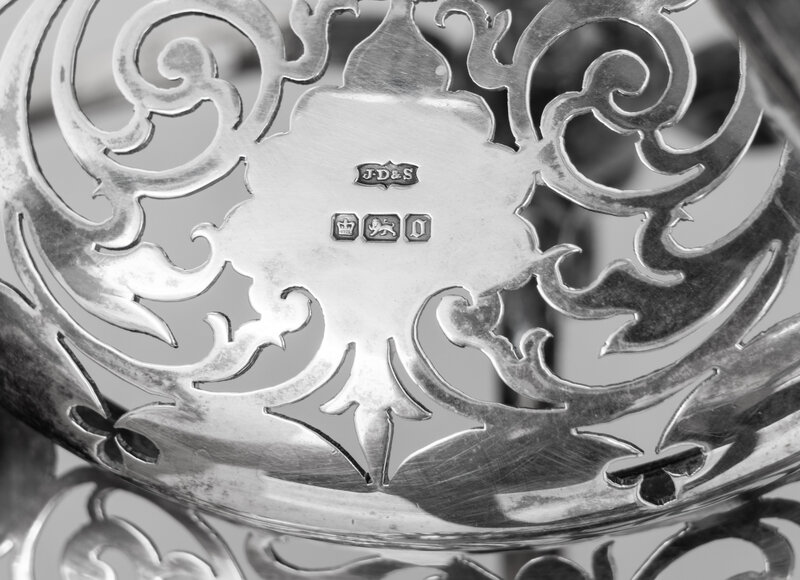 A 1906 Edward VII sterling silver epergne by James Dixon & Sons, Sheffield, featuring a central raised bowl and five surrounding dishes with ornate pierced scrollwork and floral motifs. Elegantly supported on shell-form feet and fully hallmarked.