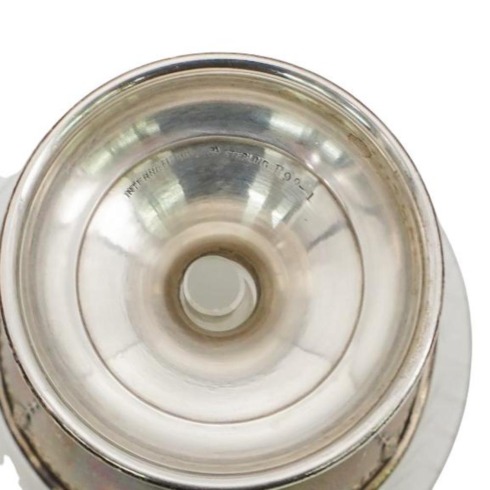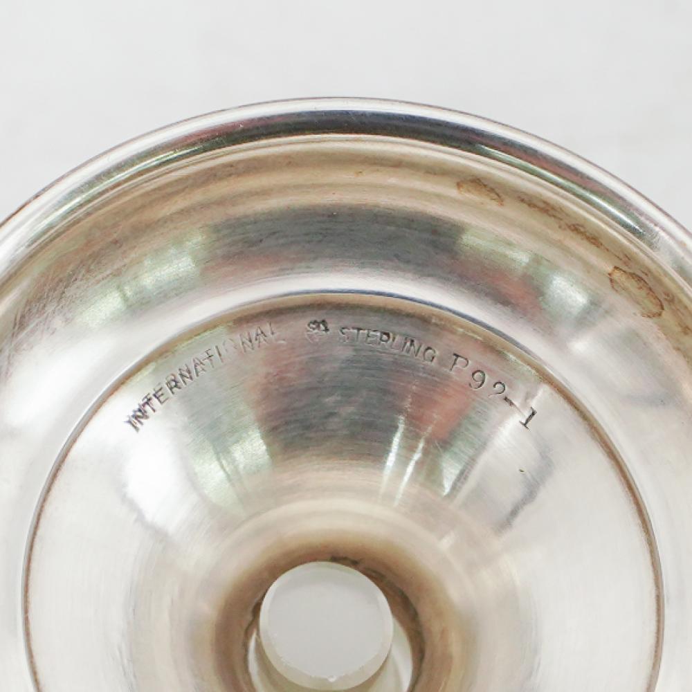 This elegant set of footed cups was produced in the early 20th century by International Silver, one of America’s most prominent silver manufacturers. Each cup features a solid sterling silver pedestal base supporting a removable etched glass bowl. The glass inserts are finely decorated with floral and geometric motifs, adding a light, decorative contrast to the weight and presence of the silver mounts.