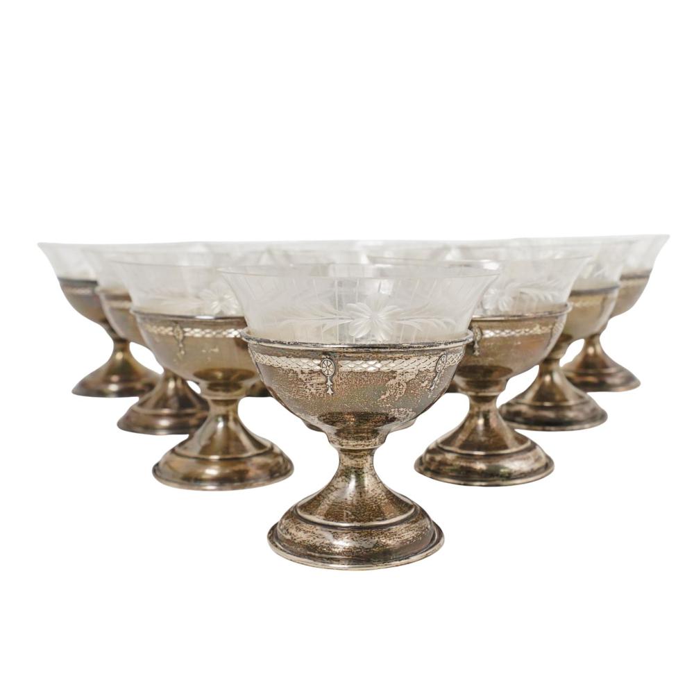 A refined early 20th-century American set of sterling silver footed cups by International Silver, fitted with delicately etched glass inserts.