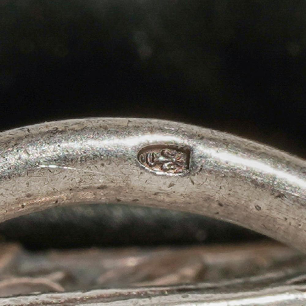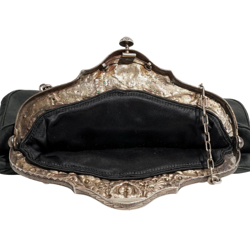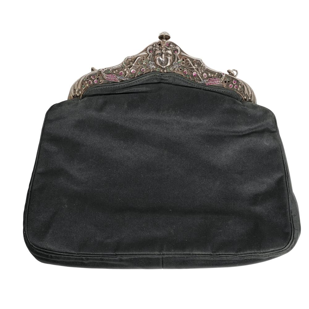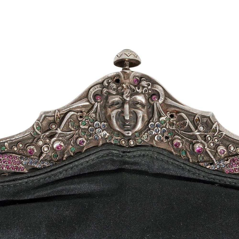 This elegant antique purse dates to the early 20th century and exemplifies refined Continental craftsmanship. The body is fashioned from black silk, complemented by an elaborately carved sterling silver frame featuring a figural motif and scrolling decorative elements. The silver mount is further enriched with natural gemstones, including emeralds, rubies, and sapphires, adding subtle color and luxury.
