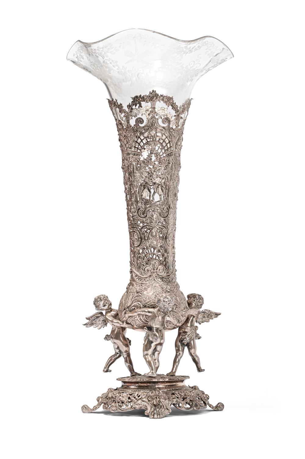An Art Nouveau silver centrepiece featuring elaborate figural and floral decoration, supported by three cherubs and fitted with a tall glass trumpet liner.