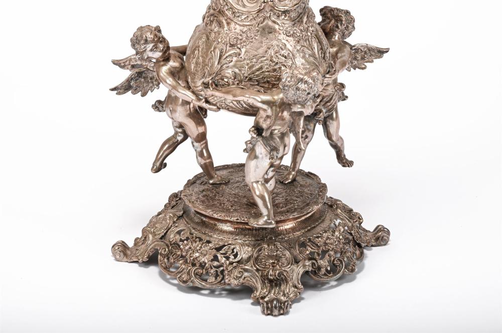 The epergne-style structure is elaborately pierced and chased with flowing floral sprays, foliage, masks, cherubs, and courting couples—motifs characteristic of the Art Nouveau period’s emphasis on naturalism and romantic themes. The dynamic composition is supported by three finely cast cherubs, which elevate the central bowl and contribute to the overall sculptural presence.