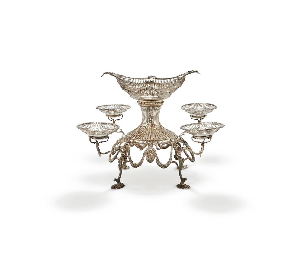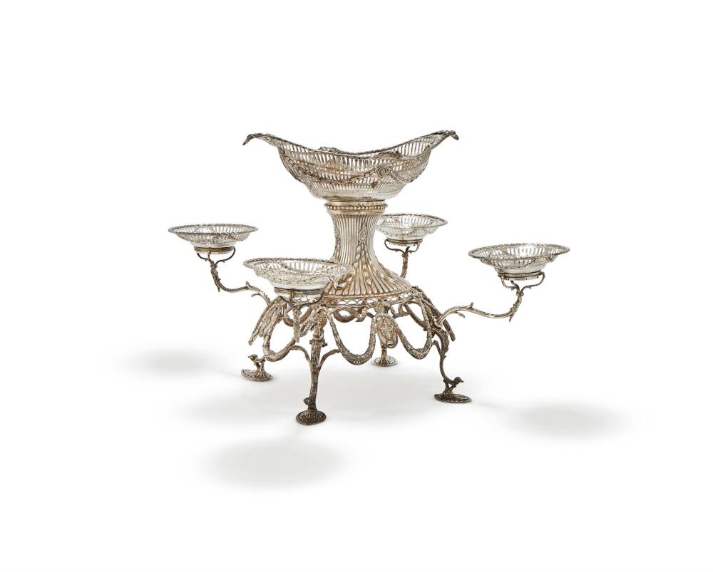 The epergne is supported on an oval stand with conforming husk bands, decorative borders, and an applied apron, raised on four scroll and shell-form feet. Four elegant scrolling branches extend outward, each supporting a circular basket, creating a balanced and architectural composition.