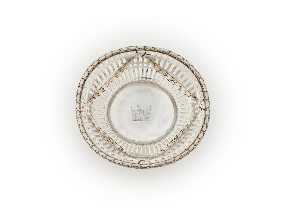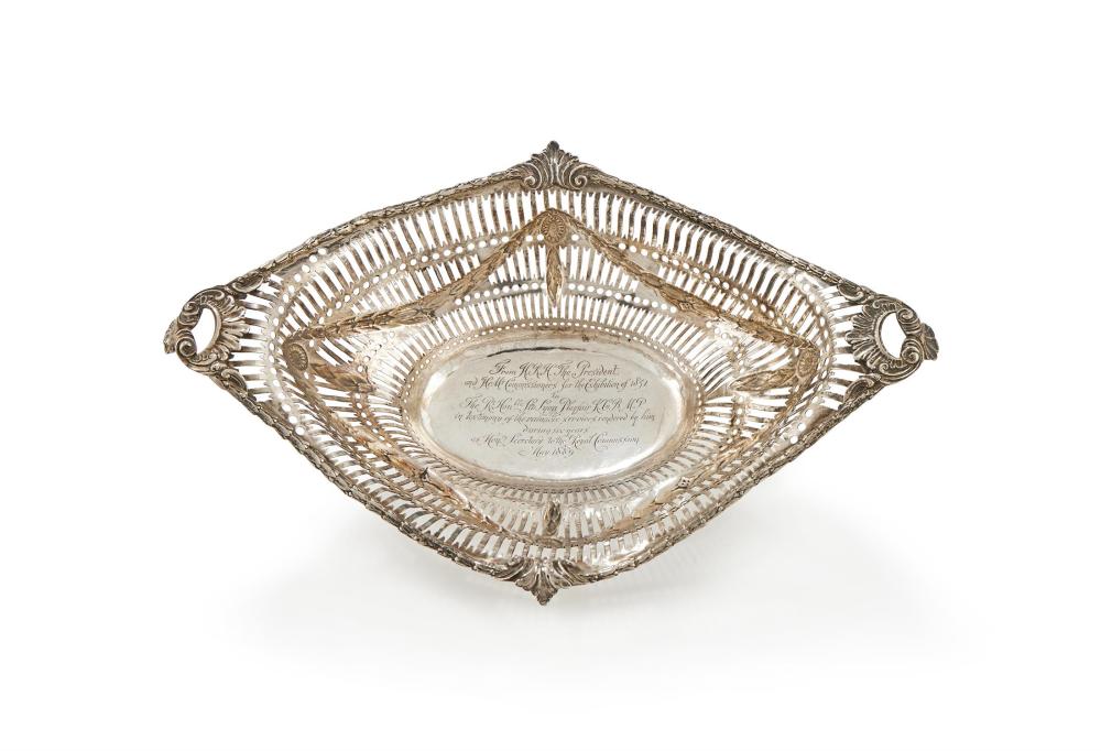 The central shaped oval basket is decorated with a chased husk and shell border, with a finely pierced body incorporating swag and medallion motifs. The piece is engraved with a detailed inscription recording its presentation by H.R.H. The President and Her Majesty’s Commissioners for the Exhibition of 1851 to The Rt. Hon. Sir Lyon Playfair K.C.B., M.P., in recognition of his six years of service as Honorary Secretary to the Royal Commission, dated May 1889.