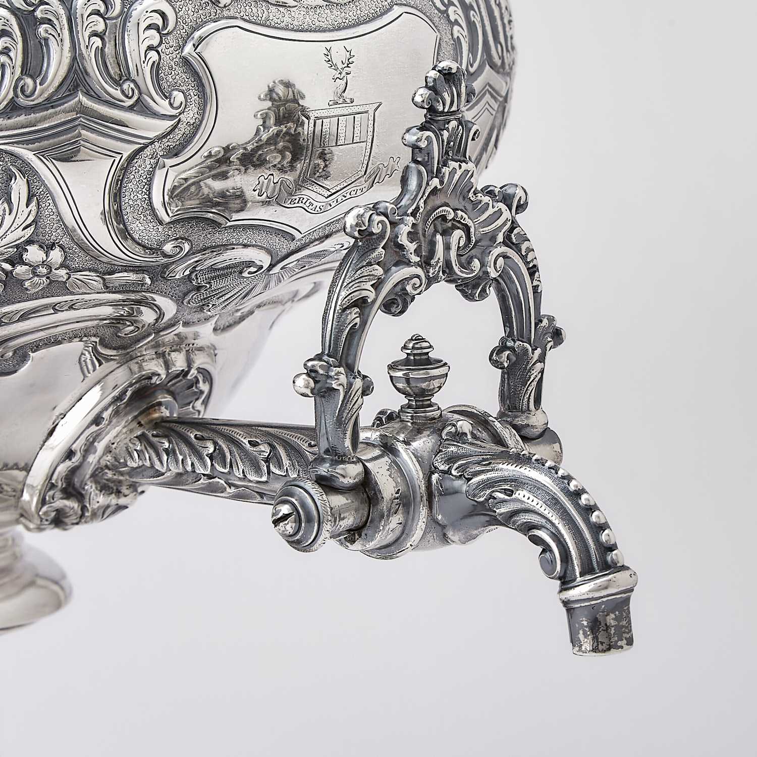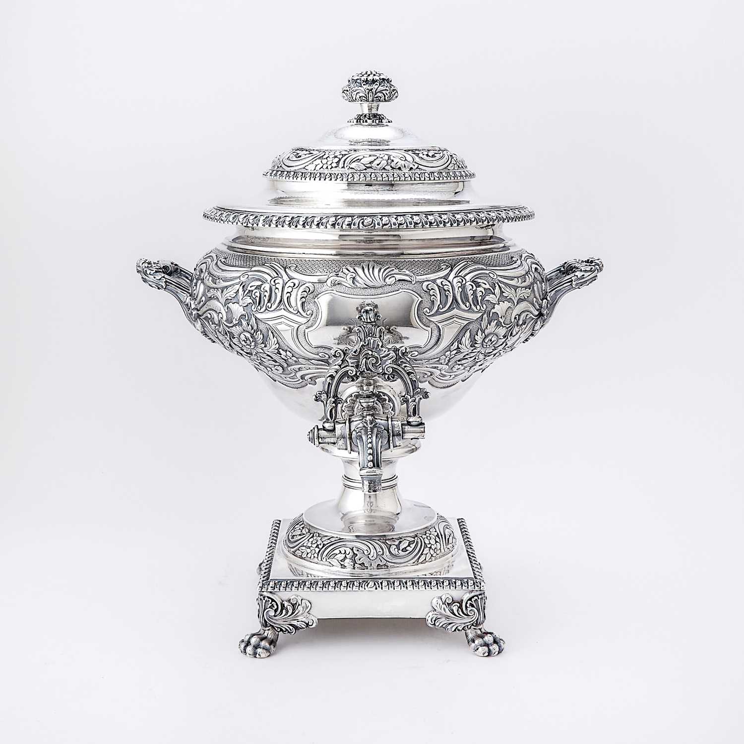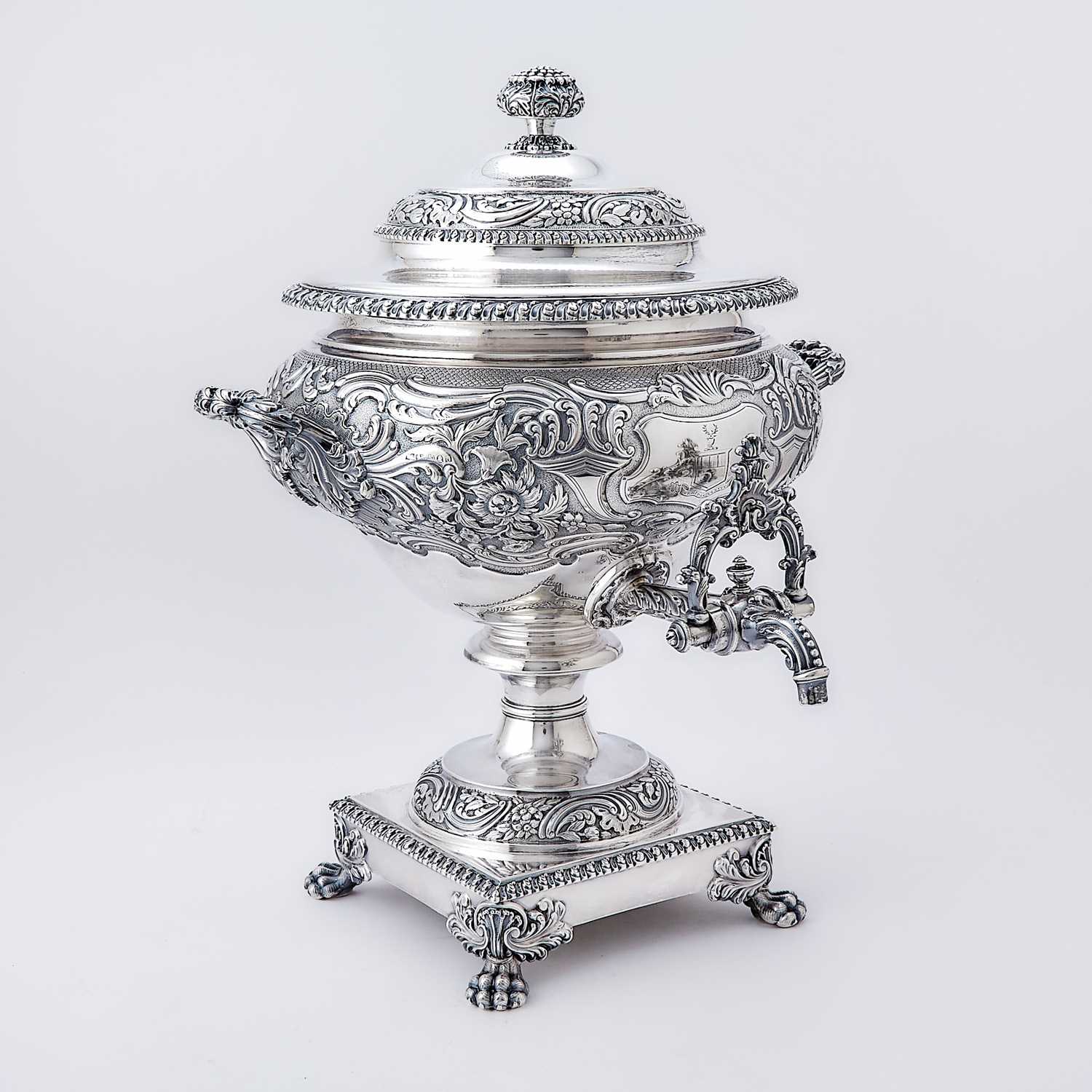 A George IV sterling silver hot water urn by S.C. Younge & Co., richly chased with floral decoration and bearing arms of the Keith family.