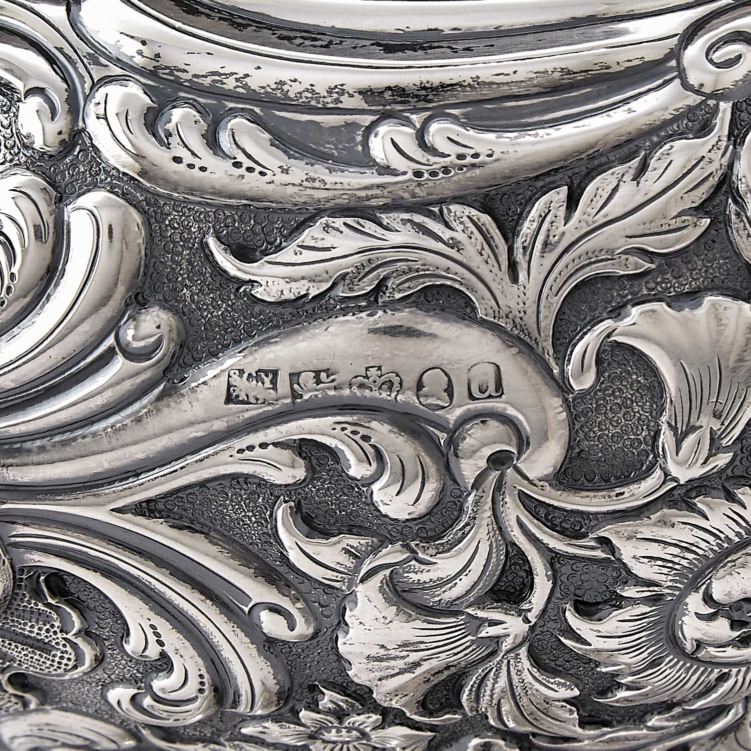 The urn is formed in a classical inverted pear shape, its surface finely chased with floral motifs and scrolling foliage, demonstrating skilled handwork typical of early 19th-century English silversmithing. It is fitted with foliate reeded handles that complement the body’s ornamentation, while the domed cover is surmounted by a blossom finial, enhancing the overall symmetry and visual balance.