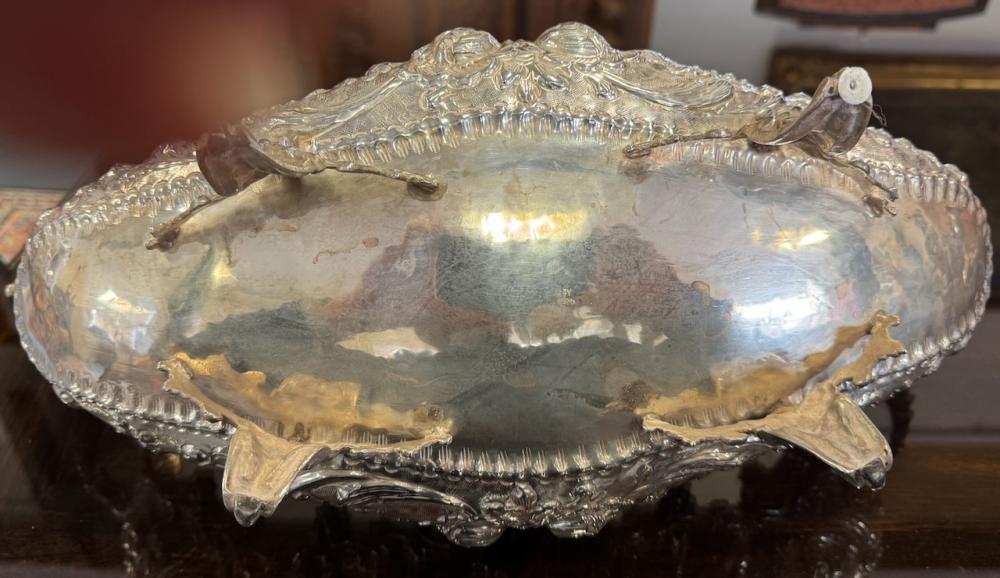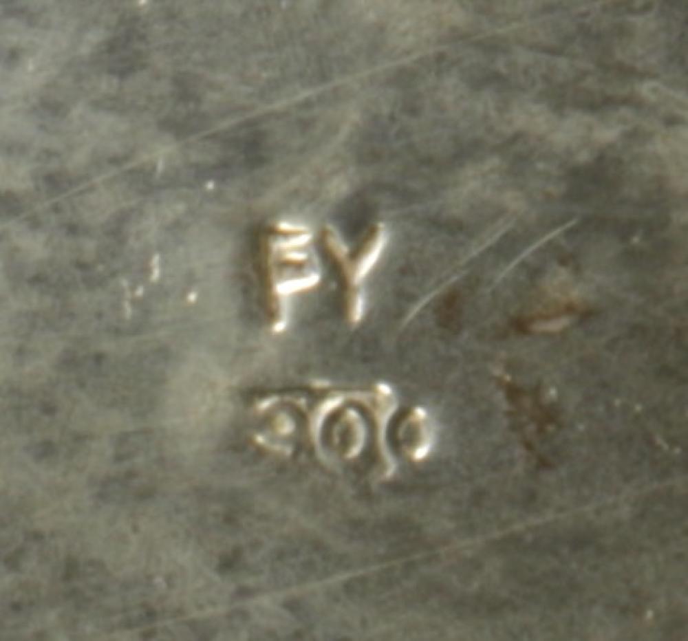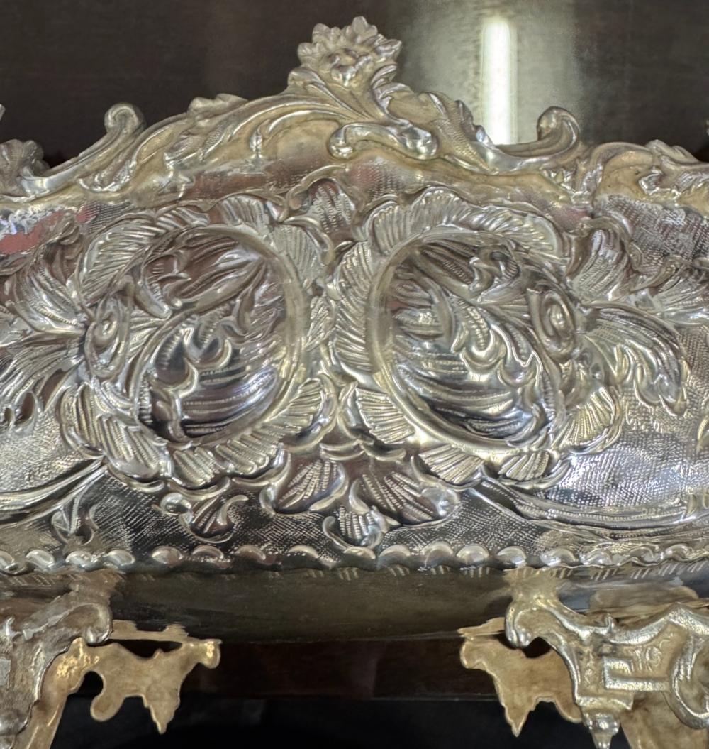The jardinière stands on four paw feet, providing both stability and visual strength. Traces of original interior gilding remain, indicating its former use as a luxury decorative or functional centerpiece. The piece is stamped with the maker’s mark “FY” and is fully hallmarked, confirming its silver content and origin.