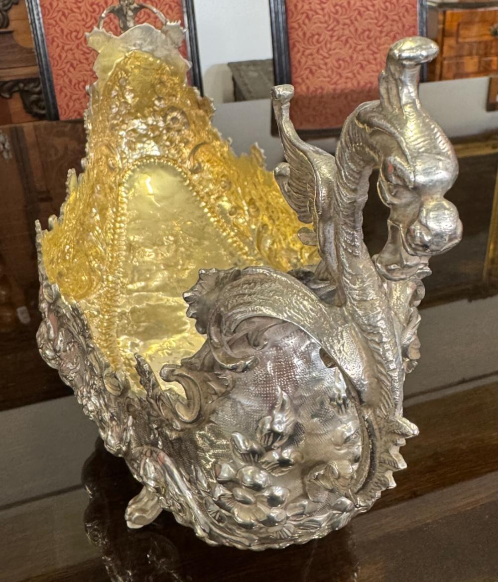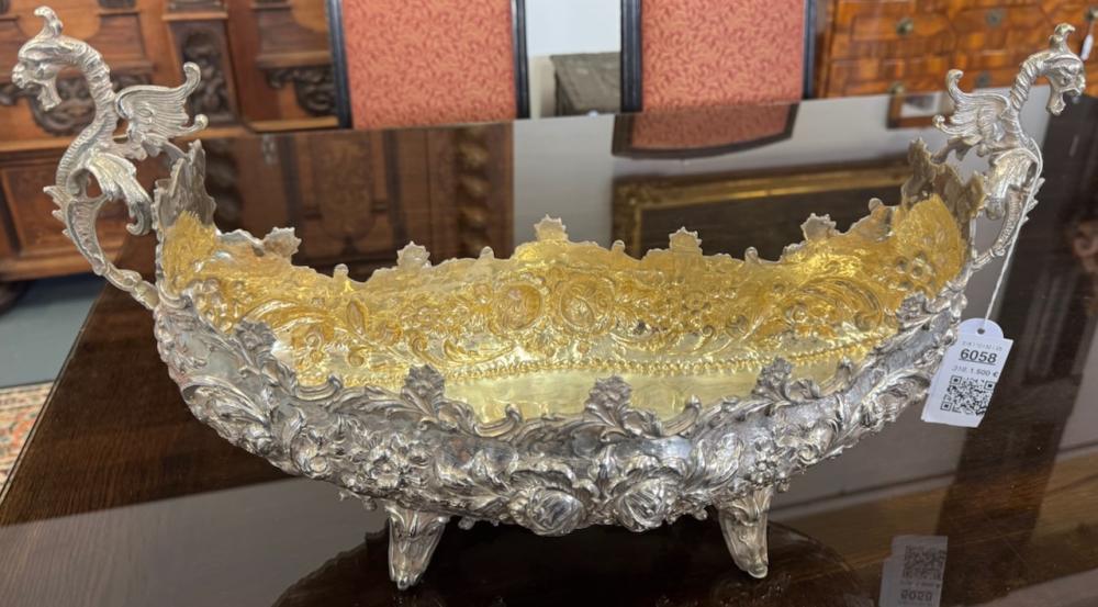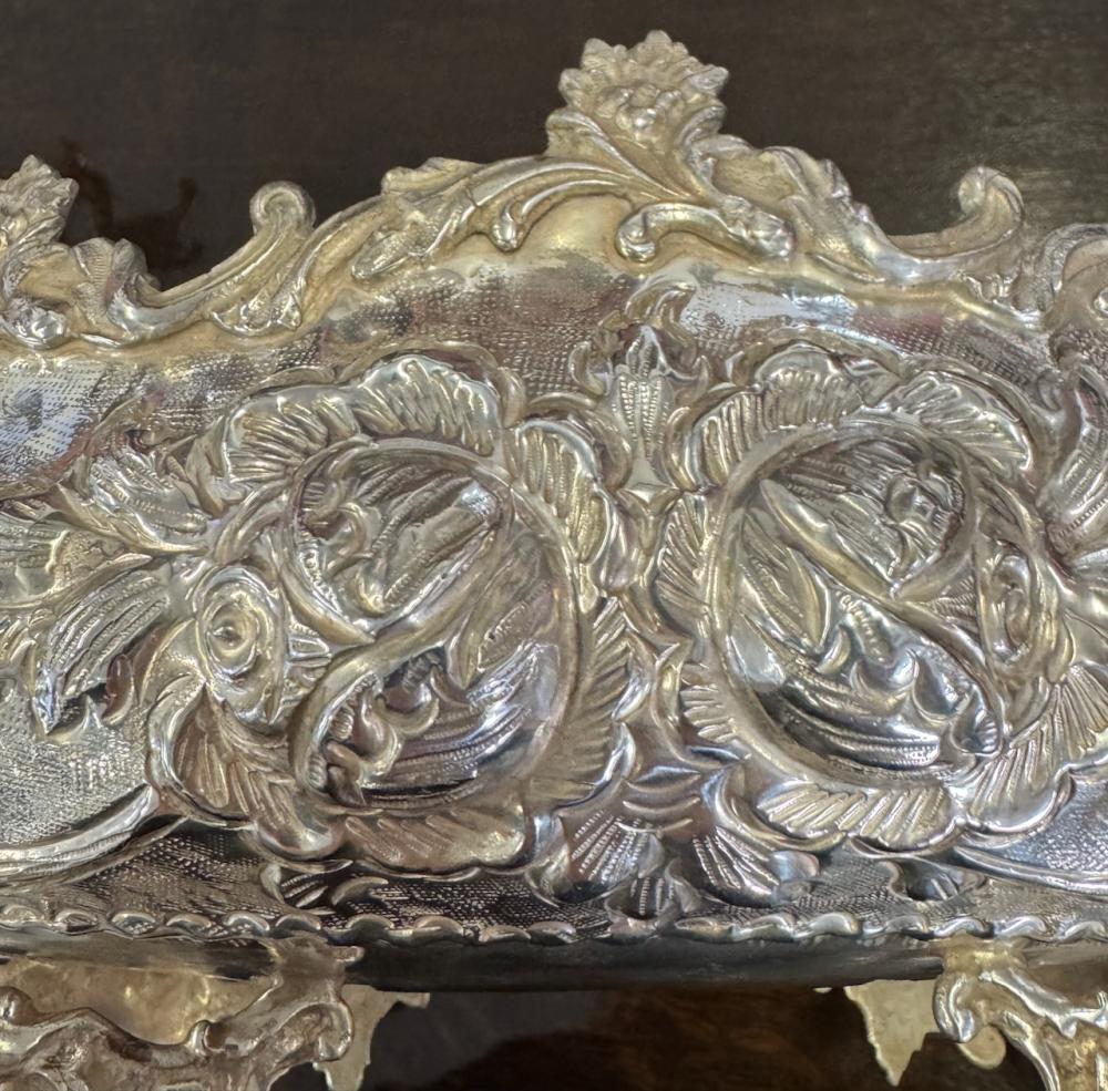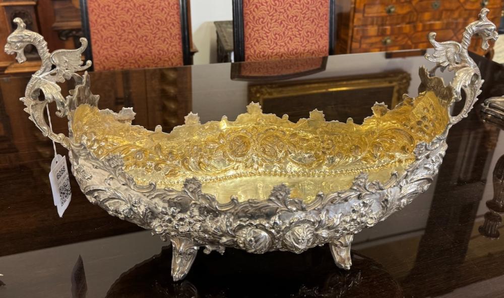 This silver jardinière dates to approximately 1900 and is likely of German origin. Crafted in .800 silver, the piece is elaborately worked in relief with dense floral decoration along the body. On each side, it features sculptural dragon-shaped handles, adding a dramatic and highly decorative element typical of late 19th- to early 20th-century design.