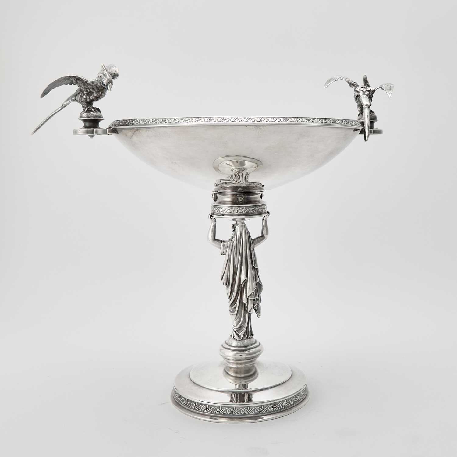 A mid-19th century Gorham sterling silver compote featuring a classical female figure supporting a bowl flanked by bird motifs.