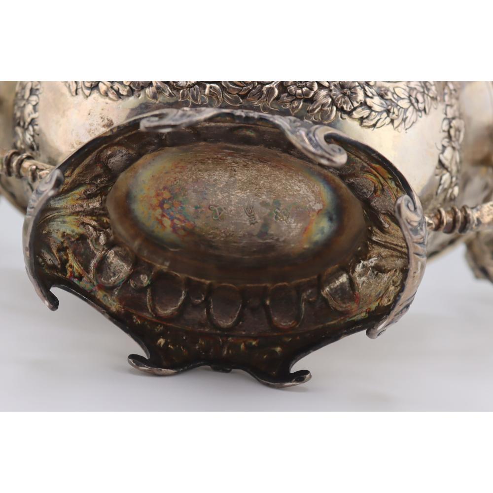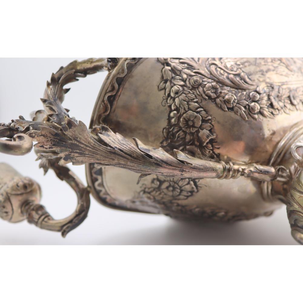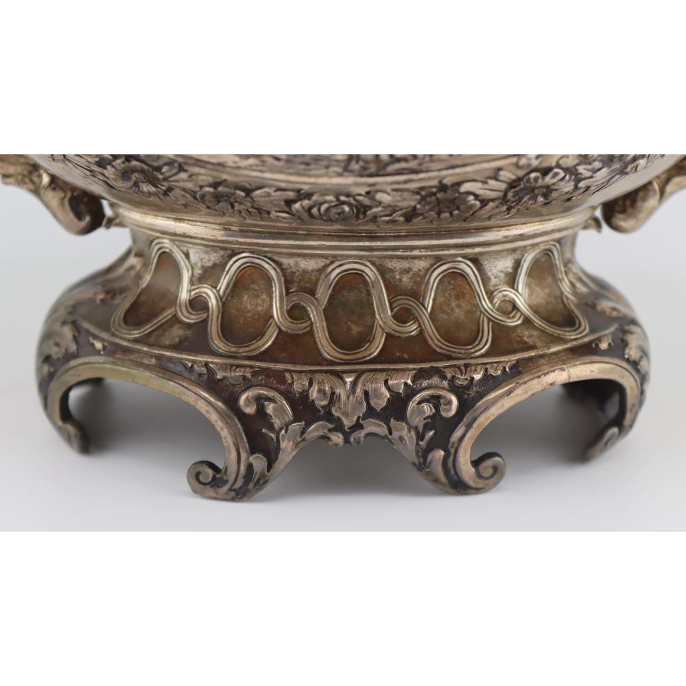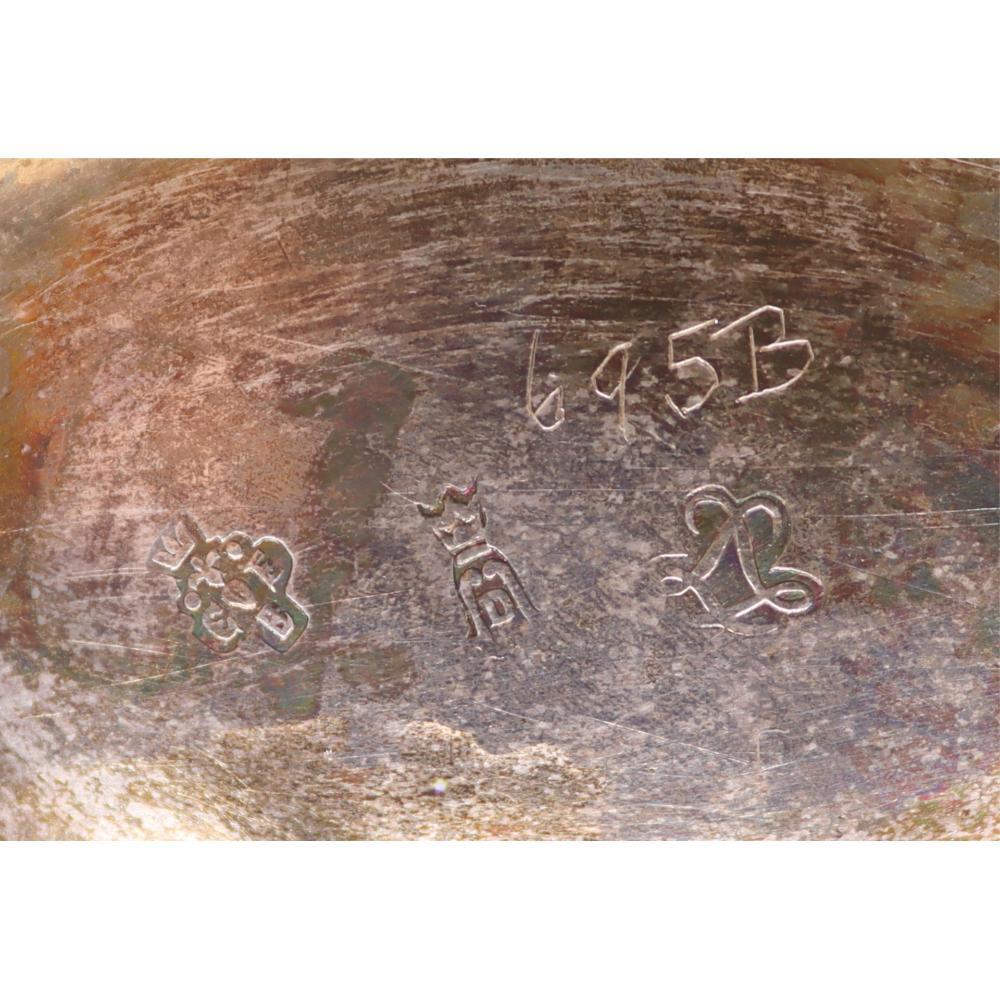 The underside is stamped with pseudo–Ancien Régime French hallmarks, a common practice among Hanau silversmiths intended to evoke earlier French silver standards rather than indicate French origin. The overall composition demonstrates the Hanau school’s emphasis on historical revival, technical precision, and decorative richness.