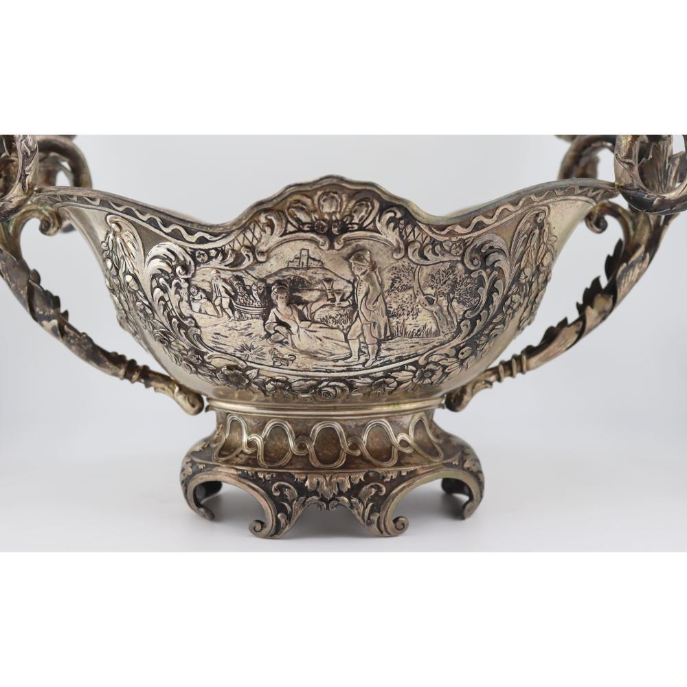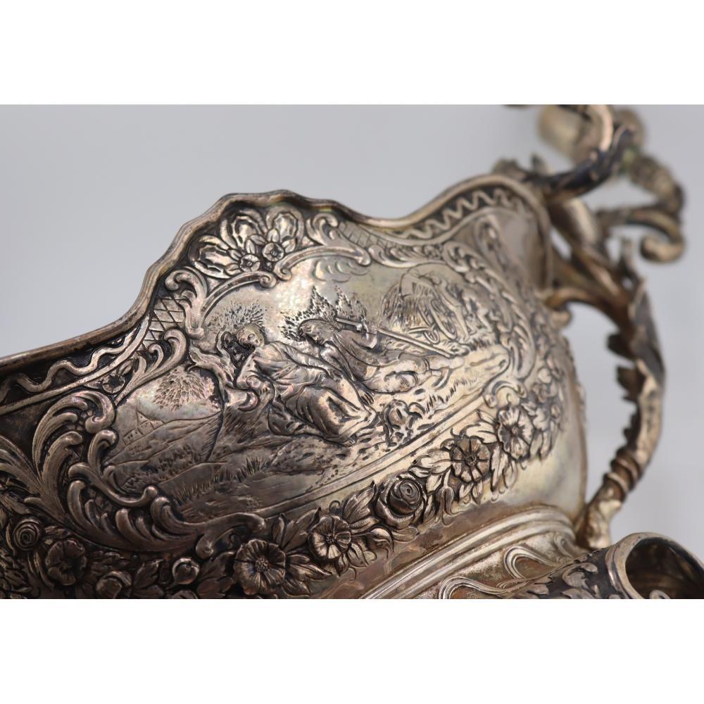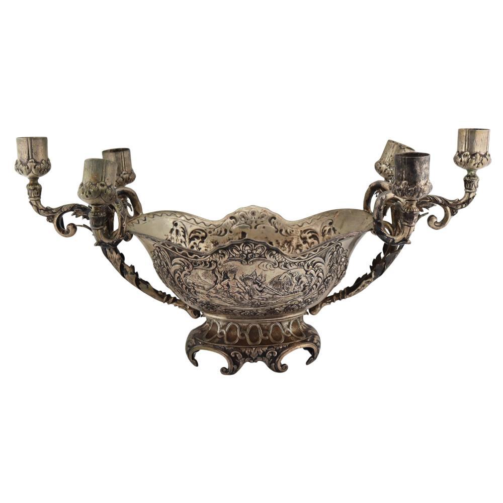 A substantial German Hanau silver candelabra centerpiece bowl with repoussé pastoral scenes and six removable candle cups, late 19th to early 20th century.