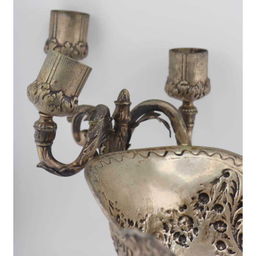Each arm terminates in a silver-mounted paneled glass candle cup, removable for versatility and ease of use. The arms and supports are elaborately chased with scrolls and floral motifs, contributing to the piece’s balanced yet visually dynamic form.