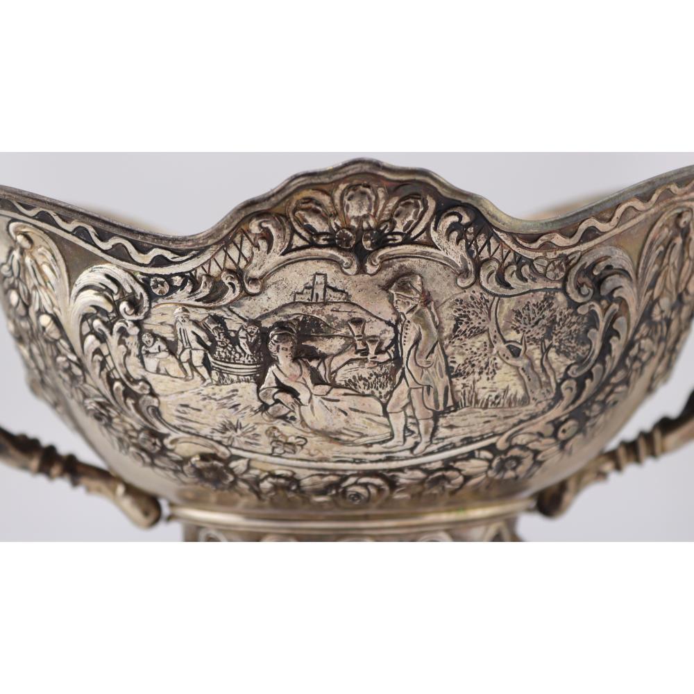 The bowl is richly decorated on each side with repoussé pastoral landscapes, depicting figures in rural settings framed by scrolling foliage and classical ornament. The repoussé work is well-articulated, with careful attention to depth and narrative detail, characteristic of Hanau silverwork inspired by earlier European decorative traditions.
