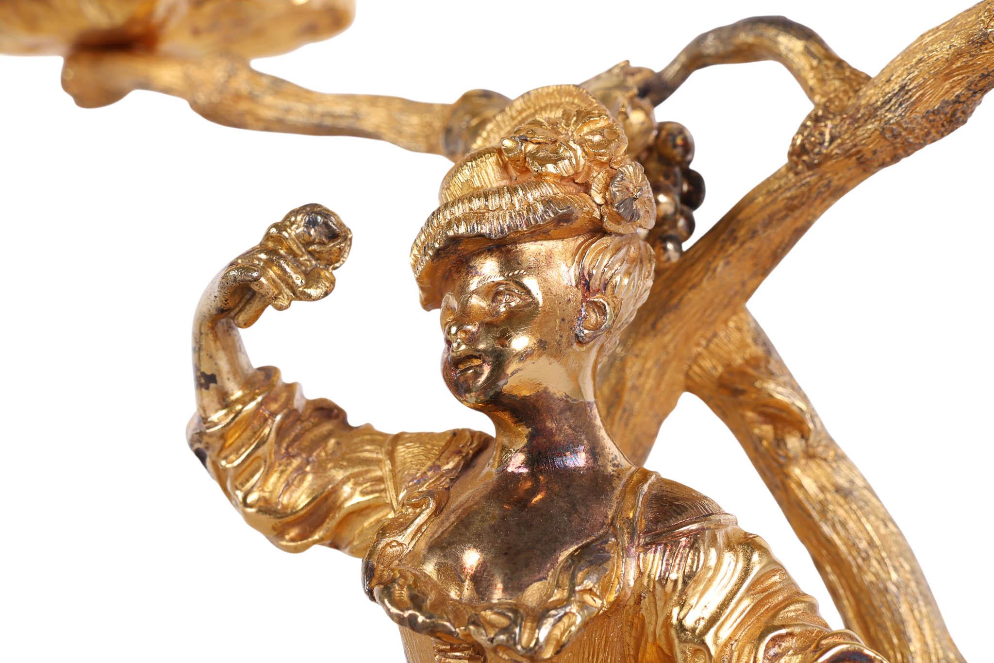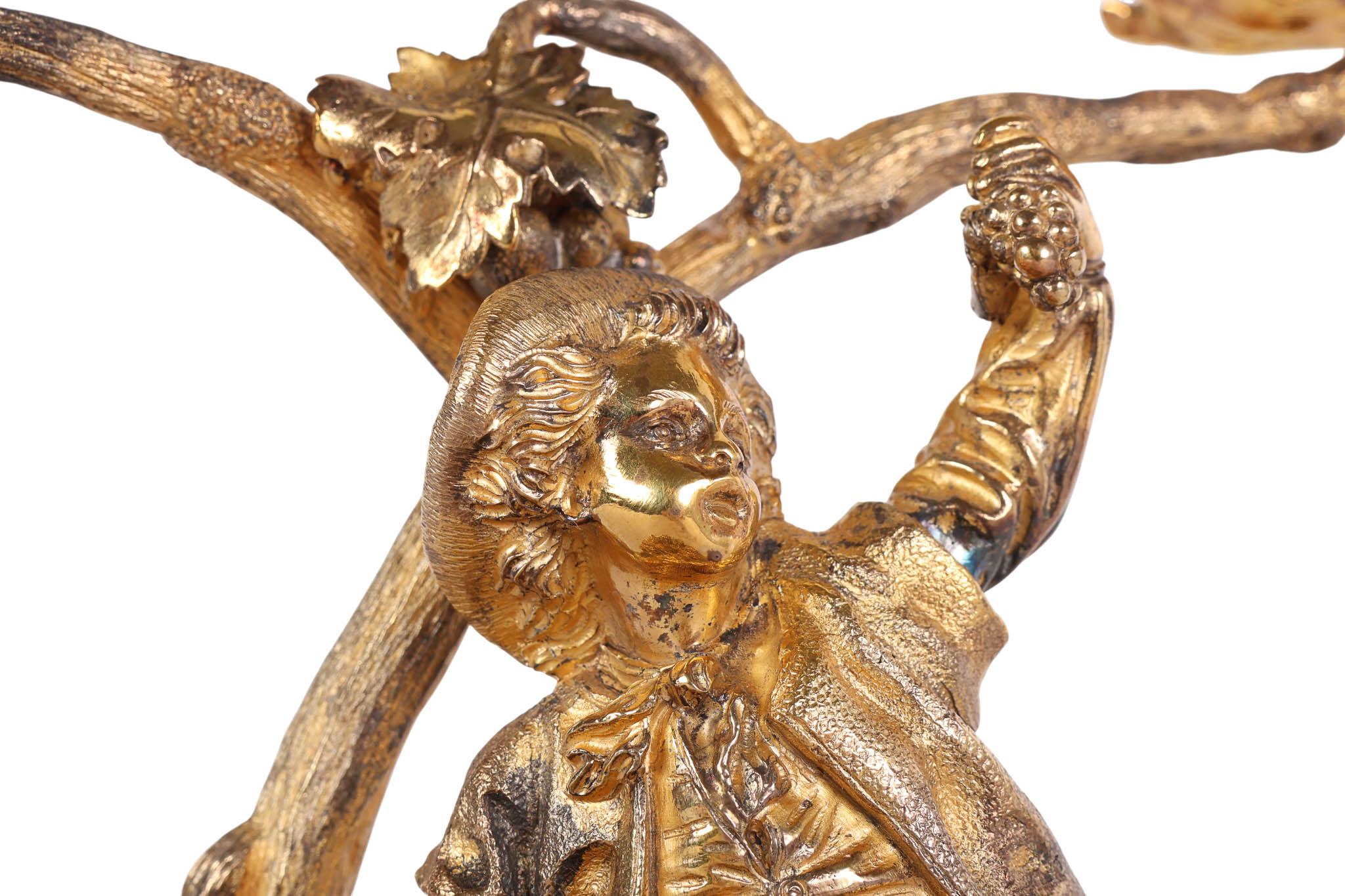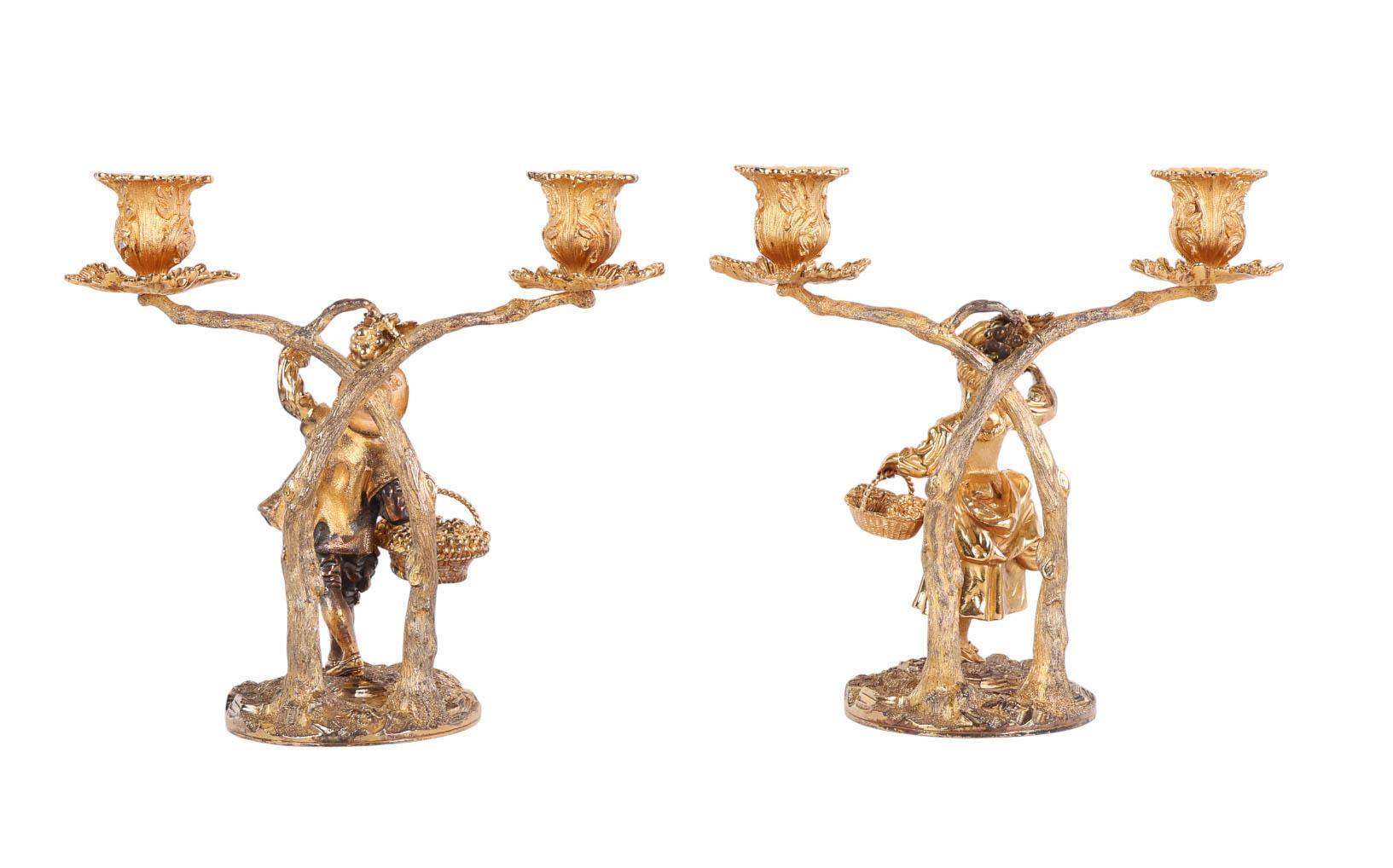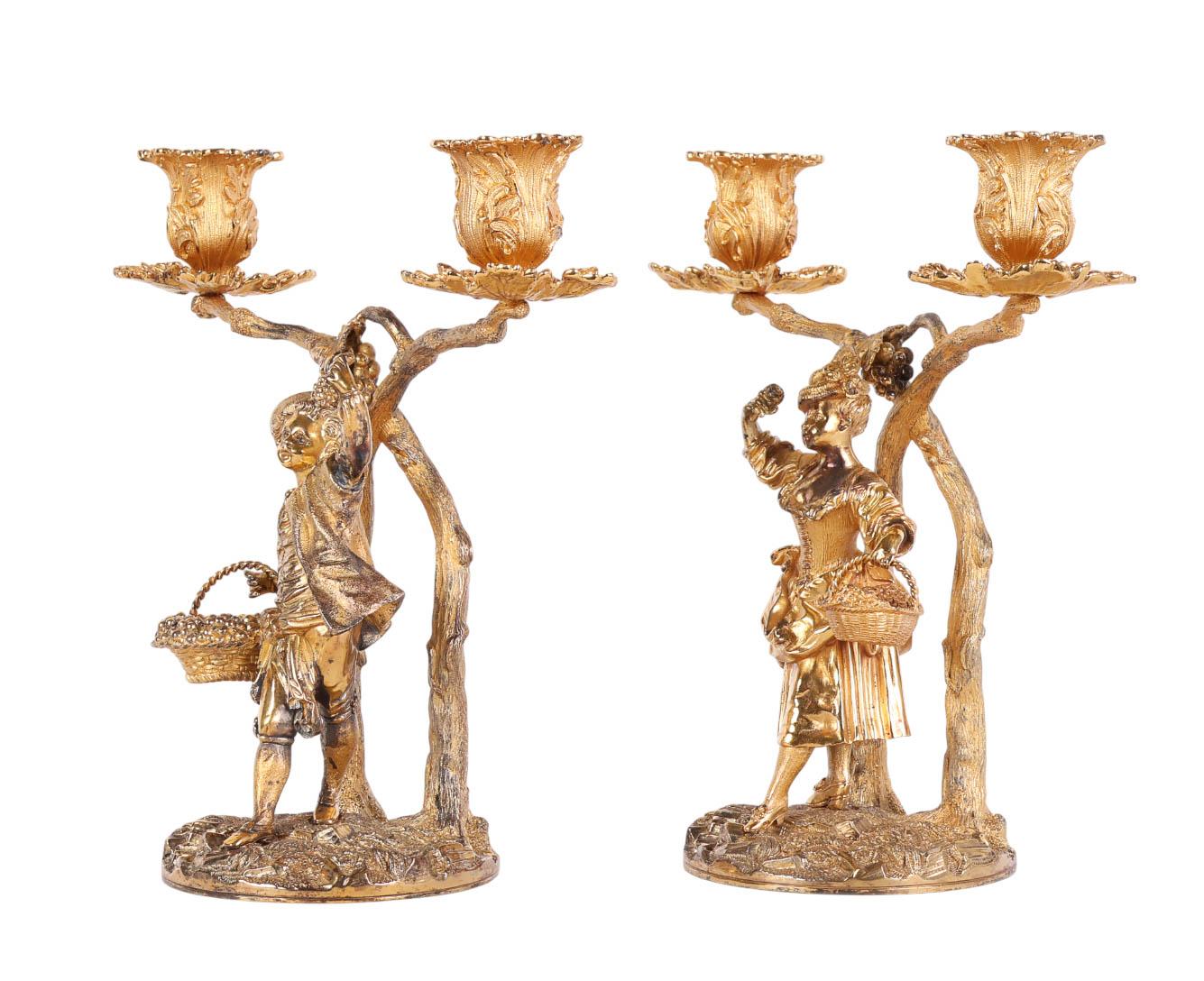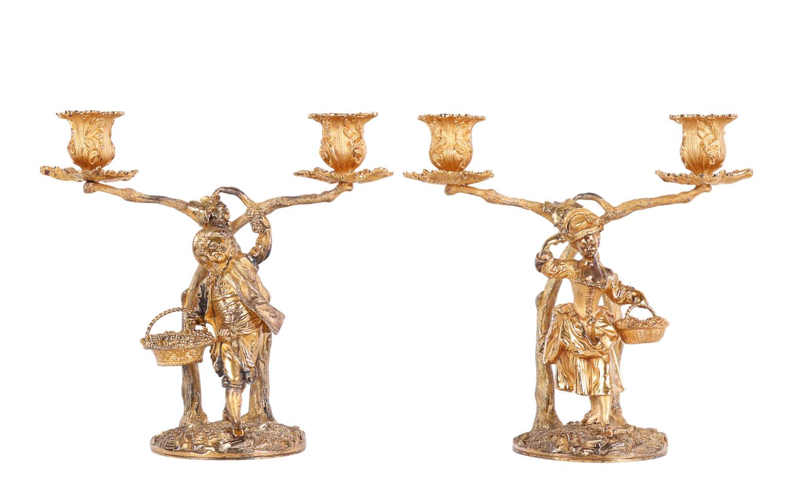 This impressive pair of English vermeil candlesticks is executed in solid cast sterling silver, richly gilt throughout, and modeled as a young male and female figure standing beneath branching grapevines. Each figure holds a basket of grapes while supporting two candle sockets formed as twisting vine branches terminating in floral sconces.