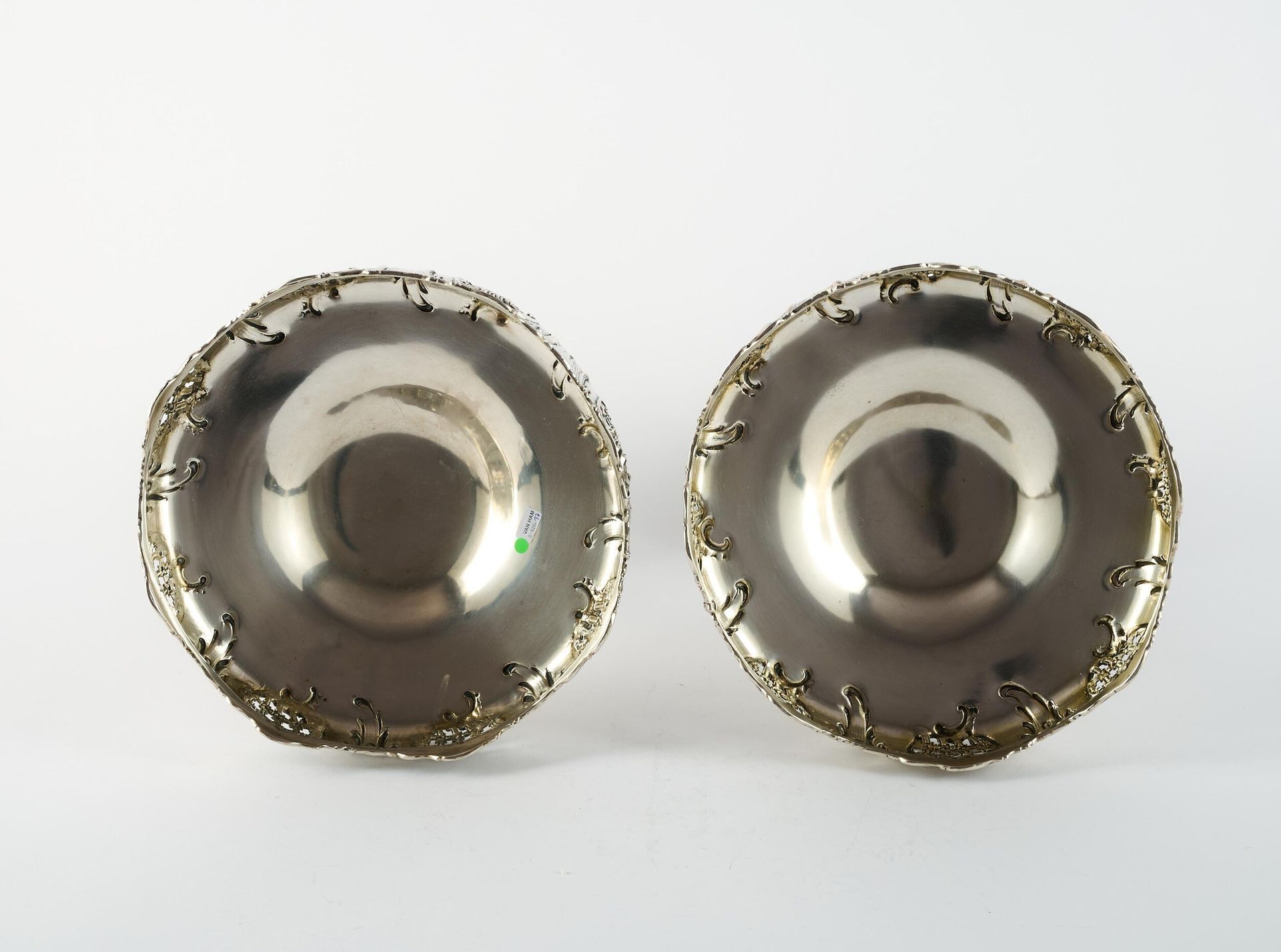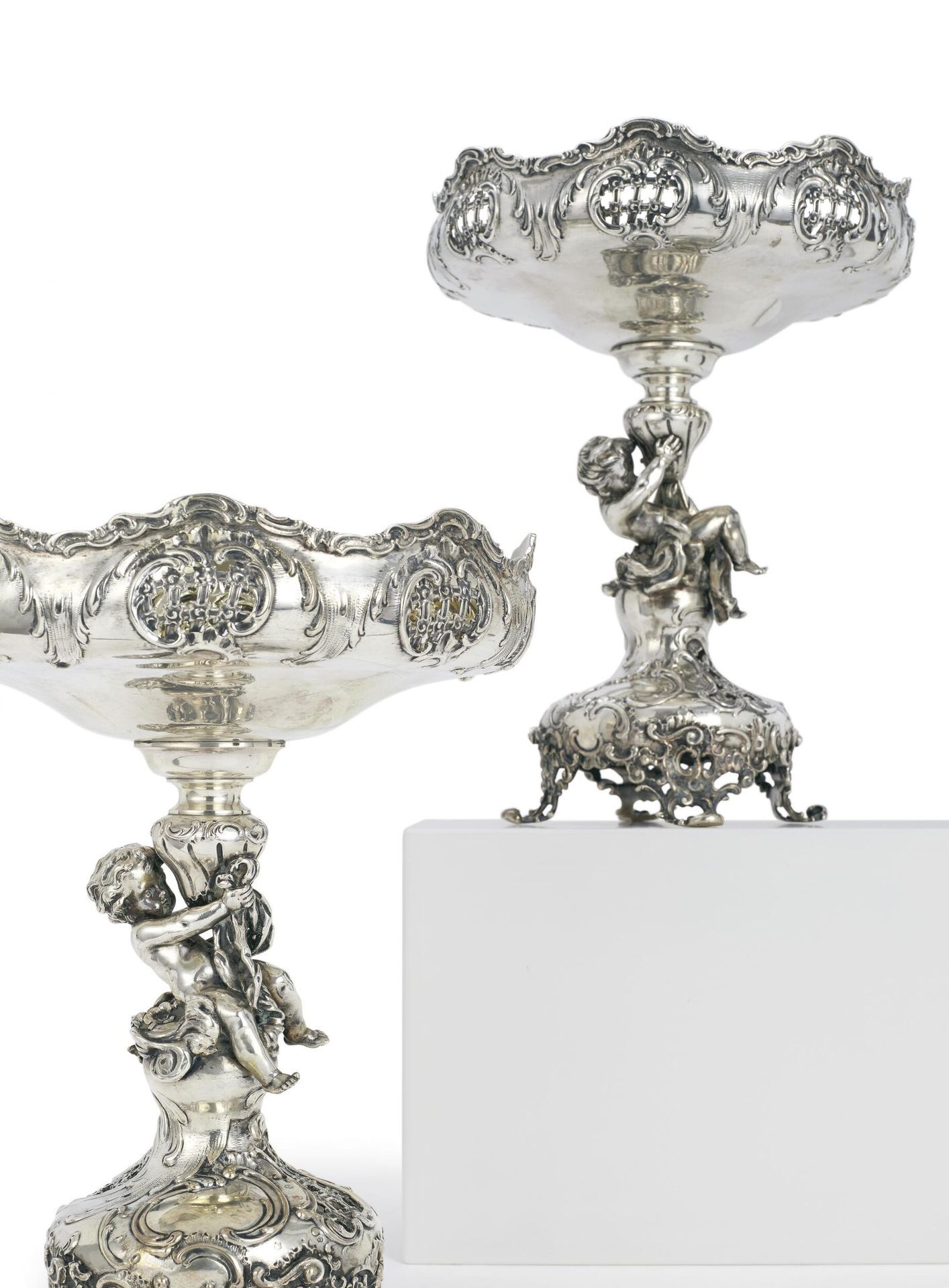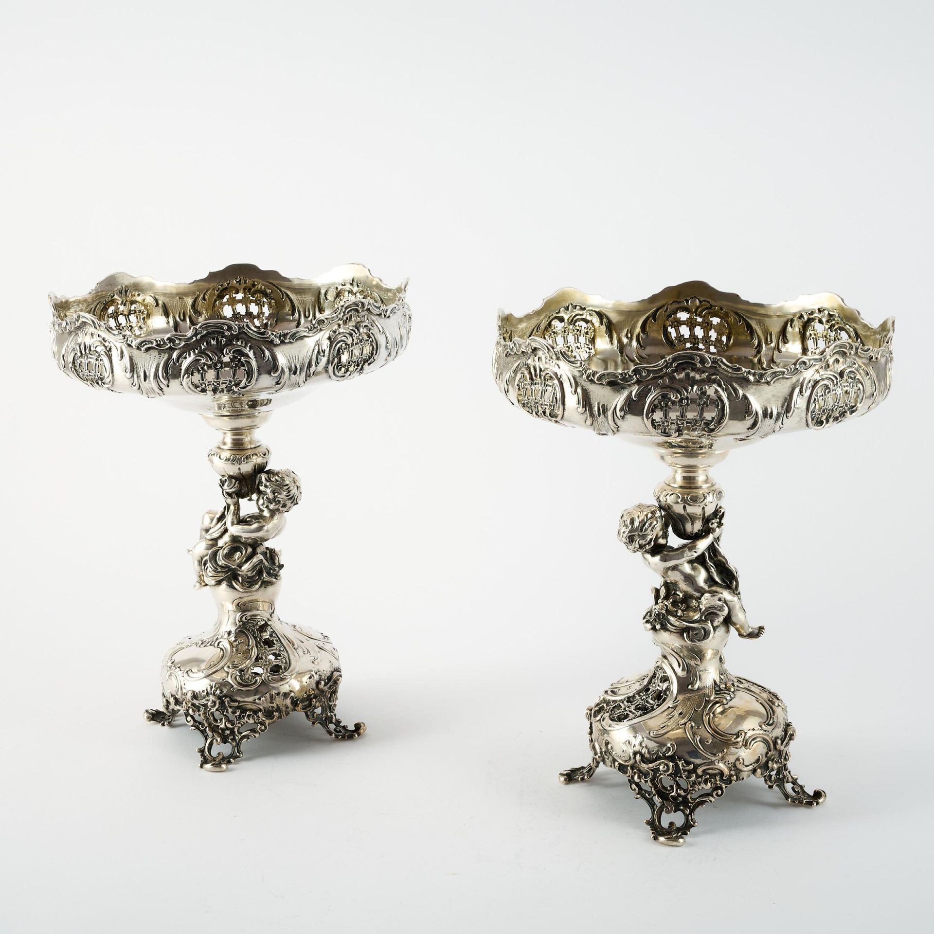 A pair of large Viennese Rococo silver centerpieces by Franz Brothers, ca. 1900, each featuring a sculpted cherub supporting an ornate bowl with pierced and scrollwork detailing. Hallmarked and richly decorated throughout.