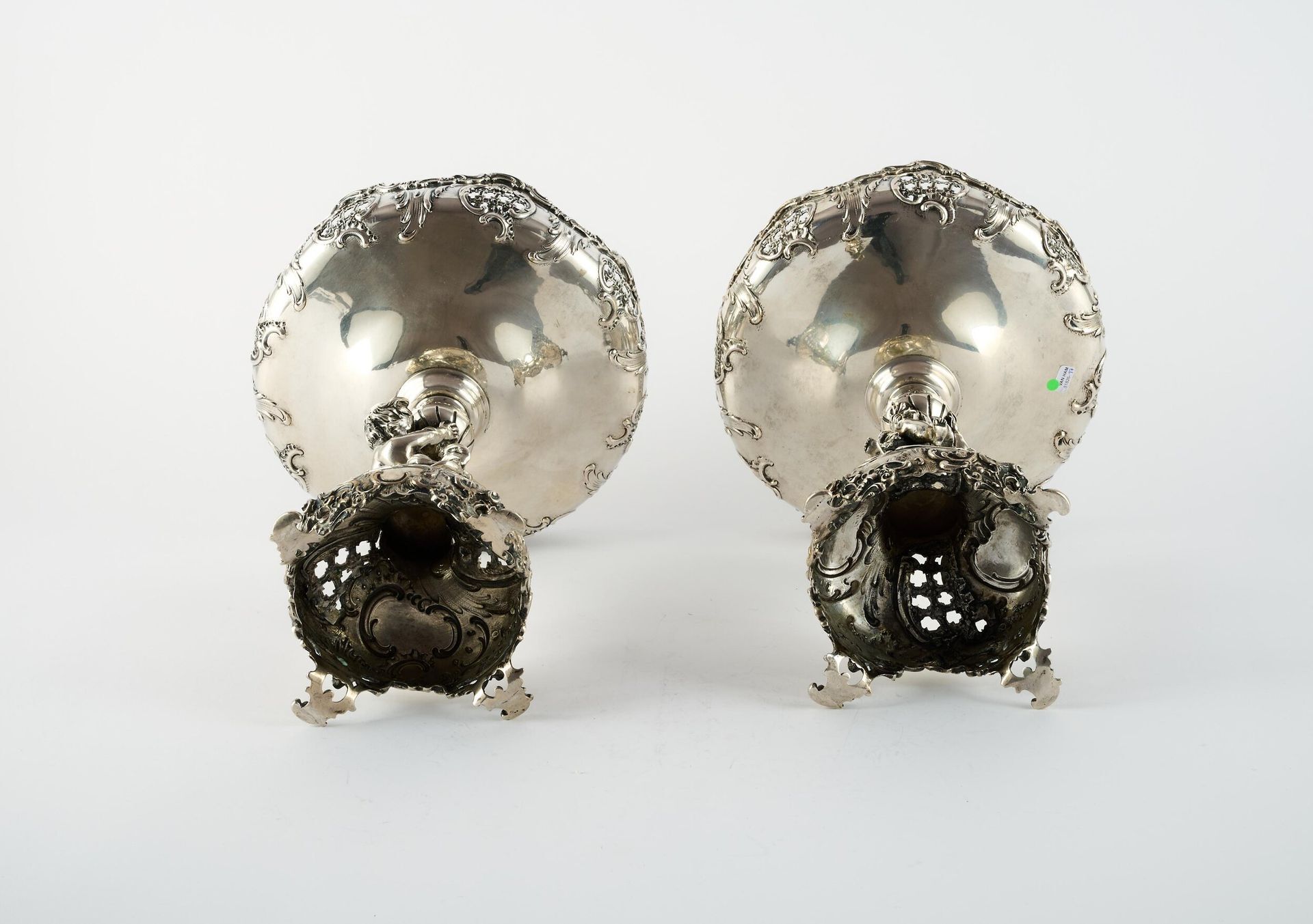 A magnificent pair of Viennese silver table centerpieces crafted by the Franz Brothers (Rudolf & Eduard Franz), active from 1887 and renowned for their exceptional Rococo-revival silverwork. Each piece rises from an elaborate circular base richly decorated with swirling shell motifs, pierced rocaille grilles, and animated cartouches.