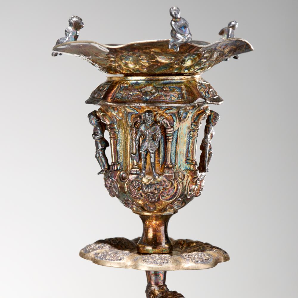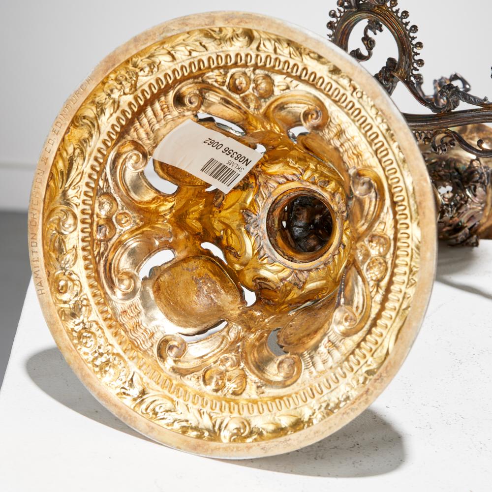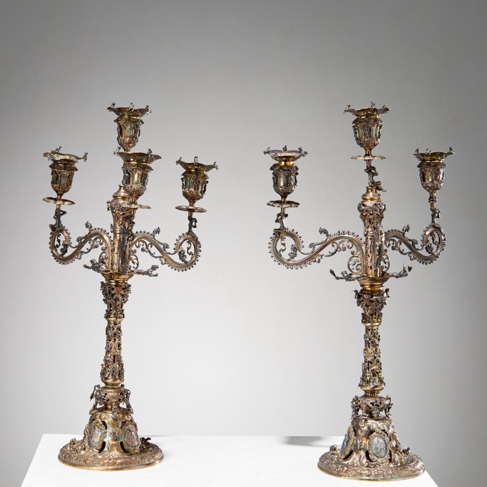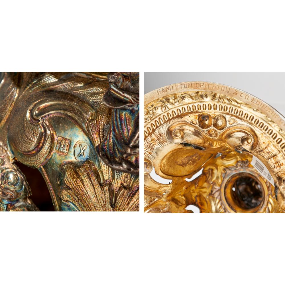 An exceptional pair of late Victorian Scottish gilt sterling silver candelabra by Hamilton & Inches (Hamilton, Chrichton & Co.), richly decorated with figural and naturalistic motifs, dated 1879.
