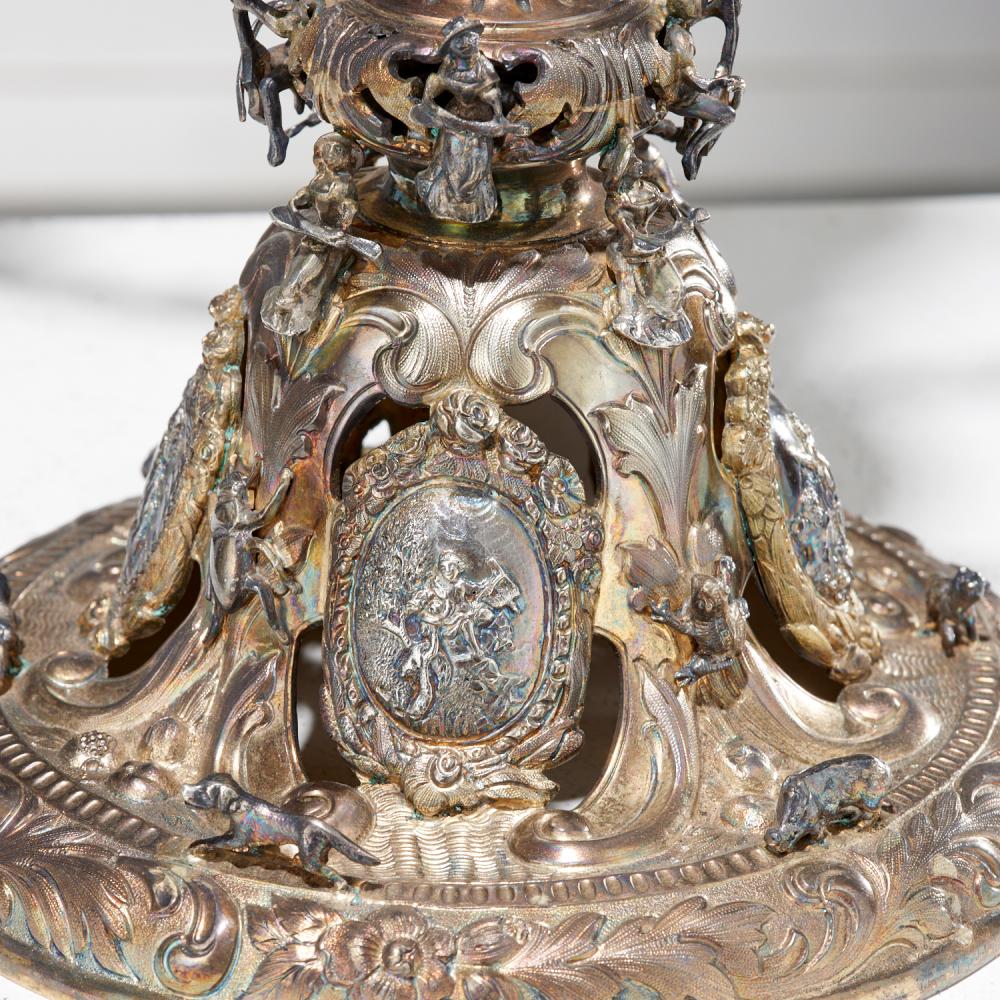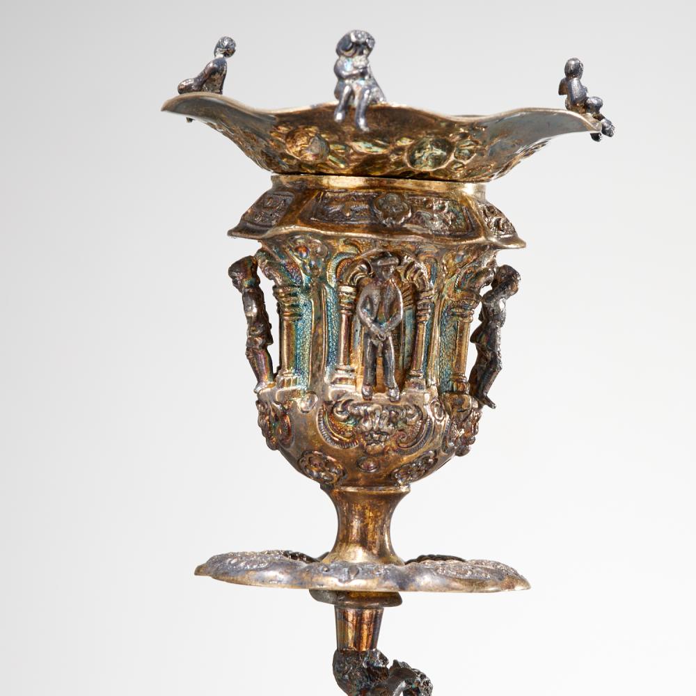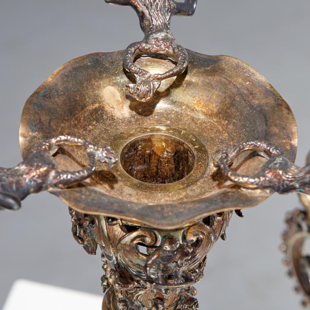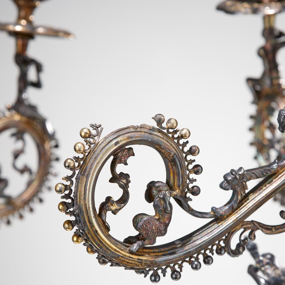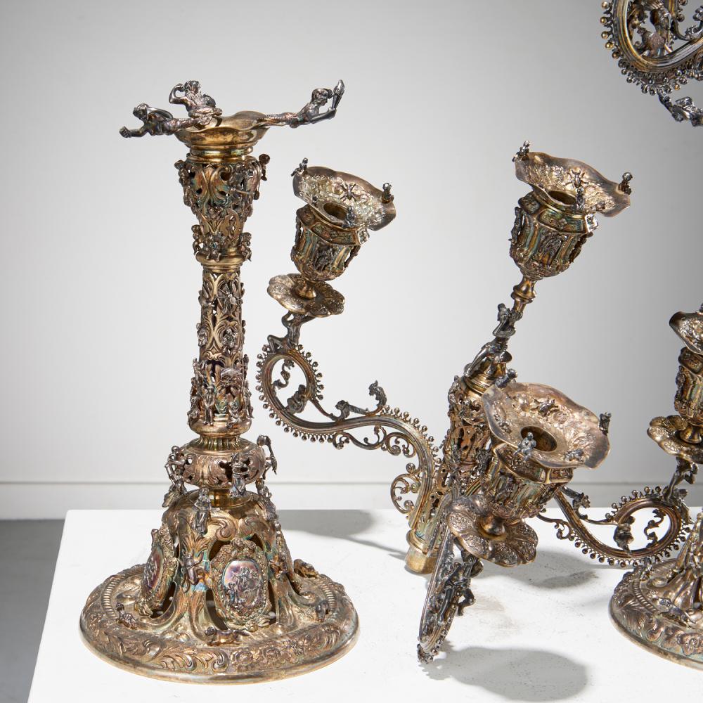 The central column is elaborately pierced and embellished with detailed figural and wildlife motifs, demonstrating exceptional craftsmanship and artistry. The arms extend gracefully from sculptural supports, including seated figures holding flutes, adding a theatrical and dynamic quality to the design.