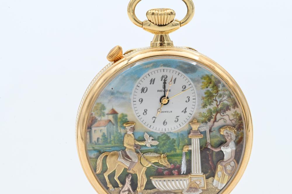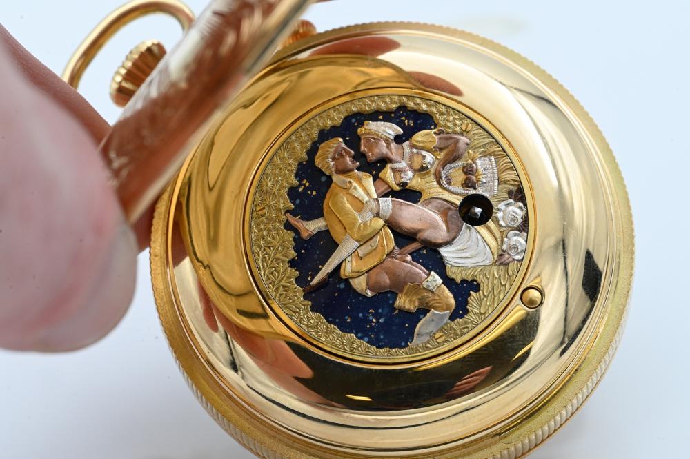An 18K gold Reuge Romance pocket watch featuring animated erotic automaton scenes and a musical movement playing Mozart, complete with key and original box.