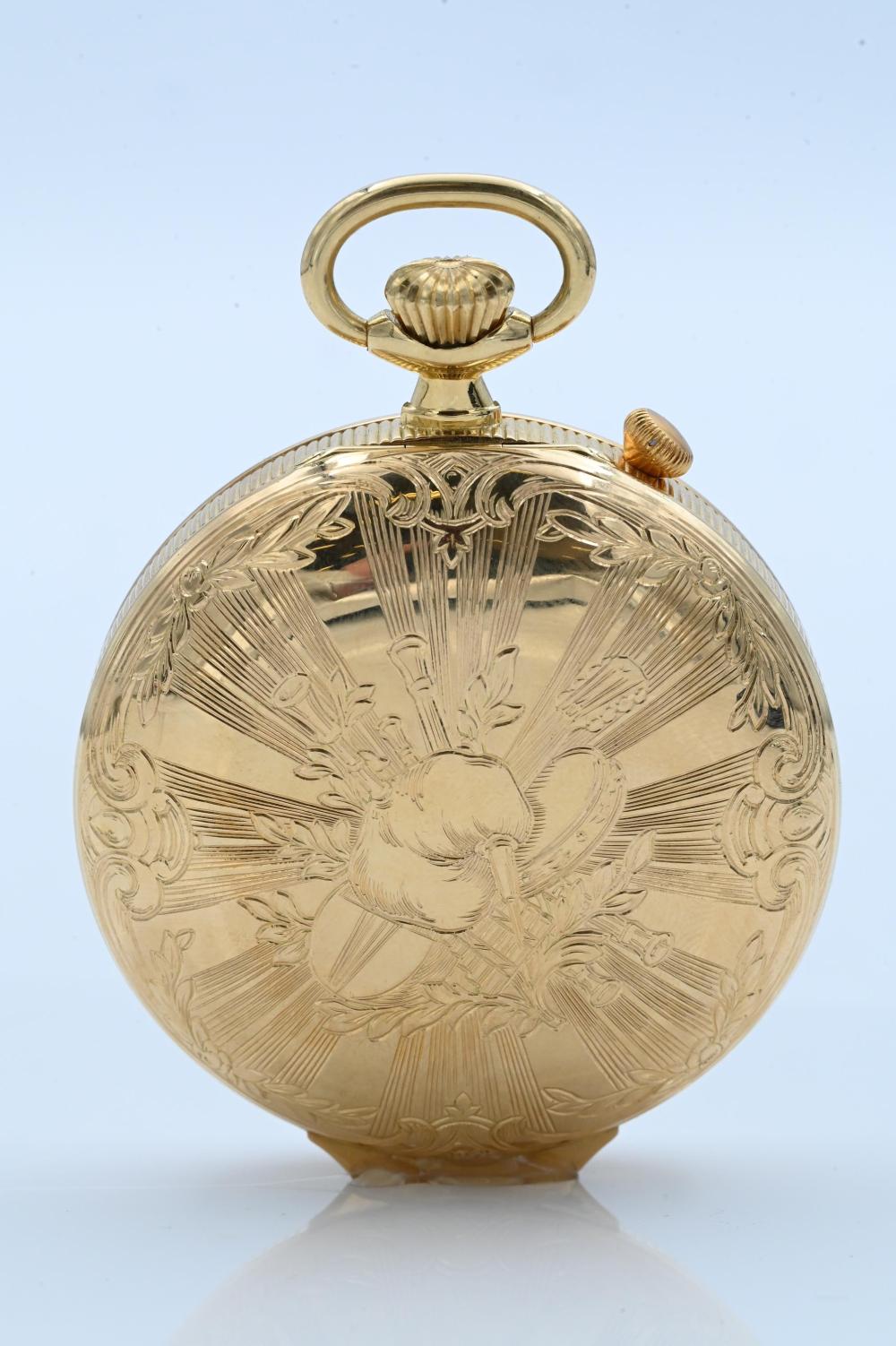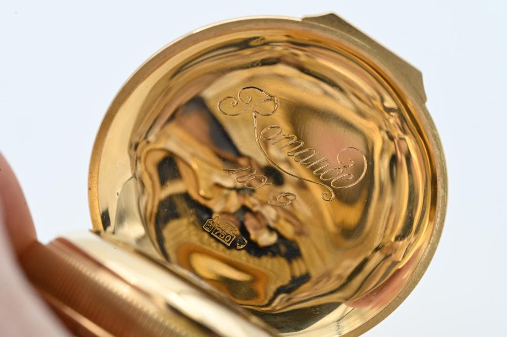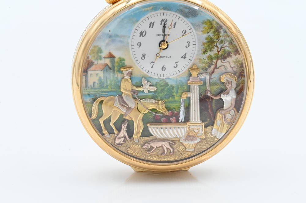 This Reuge “Romance” pocket watch is a highly decorative and mechanically engaging example of late 20th-century luxury horology, combining fine gold craftsmanship with musical and automaton features.