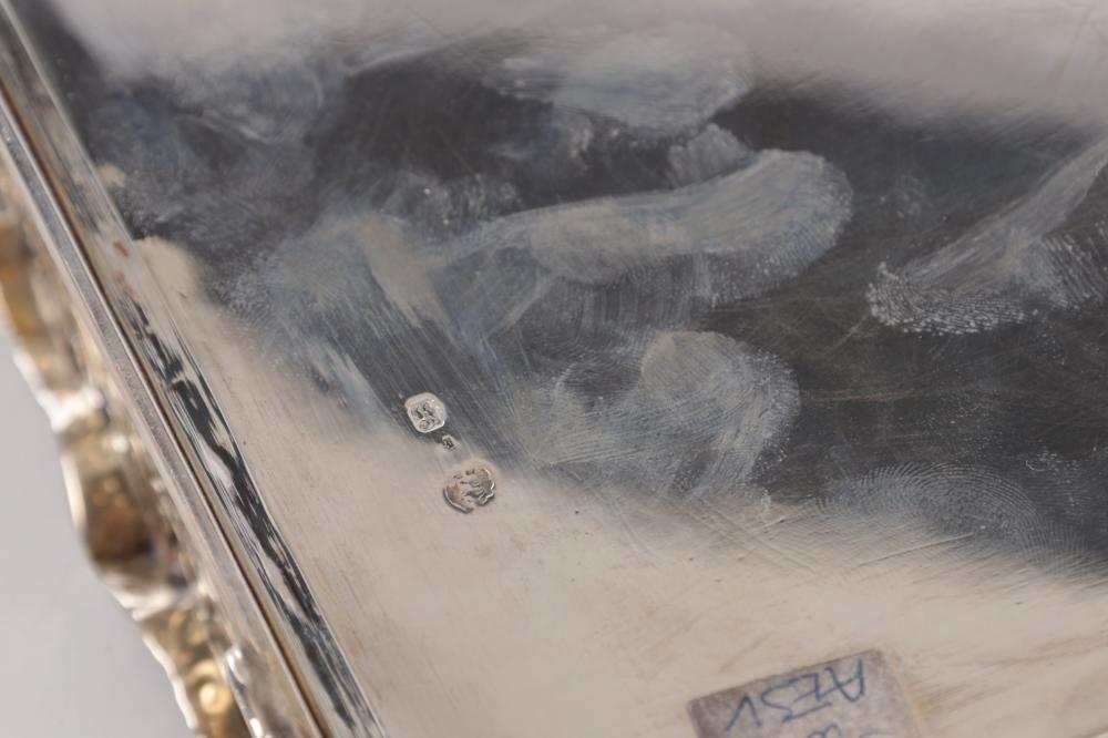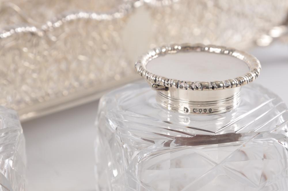 The piece is elevated on four lion paw feet, adding both visual weight and classical detailing. The combination of pierced silverwork, original glass bottles, and functional compartmentalization reflects the high standards of Victorian office and library furnishings, making this an excellent example of late 19th-century English desk silver.